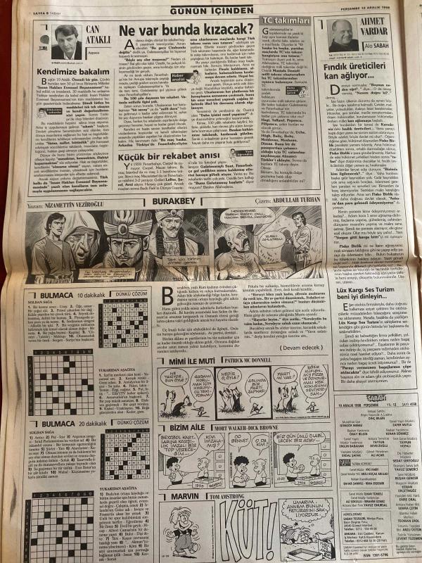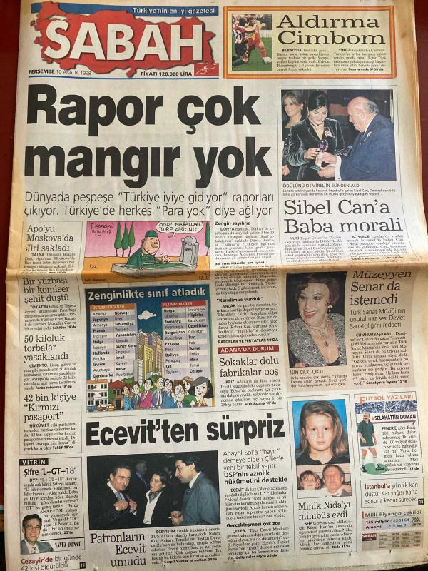 SABAH GAZETESİ DOĞUM GÜNÜ HEDİYESİ - 10 ARALIK 1998 - TAM TAKIM 34 SAYFADIR -Sibel Can-Süleyman Demirel-Nur Serter-Ecevit-Çiller-Yavuz Donat-Selahattin Duman-Minik Nida-Erman Toroğlu-Gökmen Özdenak-Buşan Gençer-Mehmet Özdil-Levent Tüzemen-Coşkun Özarı-Hıncal Uluç-Bedri Baykam-Löw-Mustafa Sandal-Sibel Can-Kenan Doğulu-Rafet El Roman Rapor çok mangır yok-Aldırma Cimbom-Sibel Can’a Baba morali-Müzeyyen Senar da istemedi-Ecevit’ten sürpriz-Türkiye ağladı-Üzülme Aslanım-Son gülen Juve-Löw takviyeyi erteledi-Trabzon’da panik yok-Musti’den Onca’ya-Afife’de buluştular-Çıldırtan oyuncak-75. isim Sibel Can mıydı-Can Ataklı-Ahmet Vardar-Nizamettin Veziroğlu-Abdullah Turhan-Patrick McDonnell-Mort Walker-Dick Browne-Tom Armstrong Ne var bunda kızacak?-Kendimize bakalım-Küçük bir rekabet anısı-Fındık üreticileri kan ağlıyor adlı eser, Kitap > Süreli Yayınlar > Gazeteler > Türkiye > Genel > Günlük kategorisinde İkinci El olarak satıştadır.