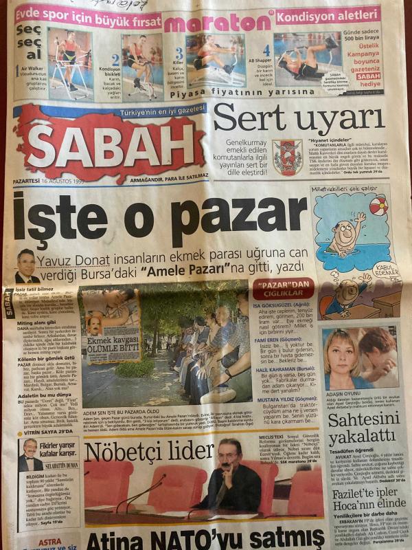 SABAH GAZETESİ DOĞUM GÜNÜ HEDİYESİ - 16 AĞUSTOS 1999 -TAM TAKIM 38 SAYFADIR -Yavuz Donat-Selahattin Duman-İsa Göksugüzel-Fami eren-Aysel çerçioğlu-necmettin erbakan-Ali coşkun-cemil çiçek-Abdullah gül-Atina NATO’yu satmış-Amele Pazarı-TSK sert uyarı-Faruk Diril-Yusuf Adalı-hülya Avşar-deniz altında 24 saat-Yusuf Gürsoy-pompalı dehşeti-Rumlardan prense taciz-prens Charles-marcio taktiği-İskender-erman toroğlu-Mehmet Ali Yılmaz-Hagi-Kadir Çetin çalı-Hakan Şükür-Avni aker’de izdiham-Erol Ersoy’a herkes kızdı-başkent’te golsüz gece-yeni lider Gençlerbirliği-Rıdvan Dilmen’e protesto-Ostenstad sınıfı geçti-cankurtaran Ahmet Dursun-3000 kişilik protesto-Beşiktaş Çarşı grubu mezarda şampiyonluğa hayır-İlker Ateş-ölüm makinesi-Eniac Pennsylvania Üniversitesi-Douglas ile jones evlilik yolunca-Murat Birsel-Coşkun Kırca-Bill Clinton-Şükrü Kızılot-Can Ataklı-Ahmet Vardar-Nizamettin Veziroğlu-Abdullah Turhan-Patrick McDonnell-Mort Walker-Dick Browne-Tom Armstrong-Erbakan faktörü-Ne genel grevi-Clint adlı eser, Kitap > Süreli Yayınlar > Gazeteler > Türkiye > Genel > Günlük kategorisinde İkinci El olarak satıştadır.