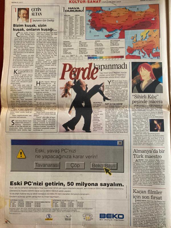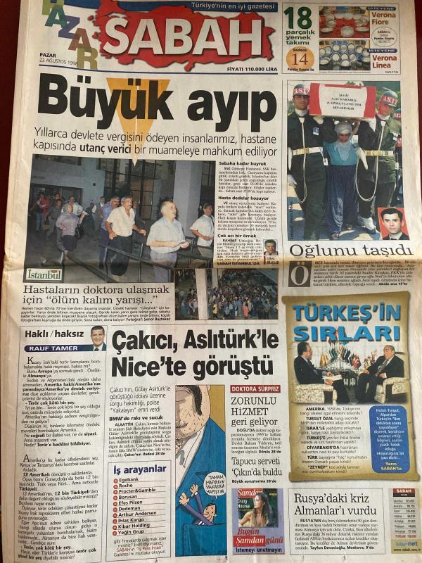 SABAH GAZETESİ DOĞUM GÜNÜ HEDİYESİ - 23 AĞUSTOS 1998 - TAM TAKIM 36 SAYFADIR -Alaattin Çakıcı-Aslıtürk-Türkeş-Tayfun Devecioğlu-Rauf Tamer-Hasan Şaş-Gökmen Özdenak-İskender Günen-Cengiz Alpman-Mehmet Özdil-Hıncal Uluç-Rıdvan Yelekçi-Susic-Saffet-Sergen-Oğuz-Oktay-Amokachi-Toshack-Seba-Mehmet Ali Yılmaz-Ruhat Mengi-Ahmet Vardar-Bulent Ortaçgil-Fatih Terim-Hagi-Kadir Tozlu-B. Hakan-Taffarel-Florence Guerin-Martine Michielsen-Carlos Fuentes-Ingrid Rubio-Jennifer Aniston-Paul Rudd-Mel Gibson-Danny Glover-Joe Pesci-Rene Russo-Chris Rock-Jet Li-Kevin J. Connor-Wes Studi Büyük ayıp-Oğlunu taşıdı-Çakıcı Aslıtürk’le Nice’te görüştü-Zorunlu hizmet geri geliyor-Türkeş’in sırları-Rusya’daki kriz Almanlar’ı vurdu-Trabzon tutulmuyor-Milo’ya duacıyız-Herkül gibi Galatasaray-Kırmızı kart Hagi’yi çıldırttı-Avrupa Avrupa duy sesimizi-Boğalar doludizgin-Karakartal’da Oktay sevinci-Dadaş destanı-Cehennem Silahı 4-Derinlikte Dehşet-Karmaşık Hisler-Taxi-Lolita-Aşkımın Hedefisin-Derin Darbe Cehennem Silahı adlı eser, Kitap > Süreli Yayınlar > Gazeteler > Türkiye > Genel > Günlük kategorisinde İkinci El olarak satıştadır.