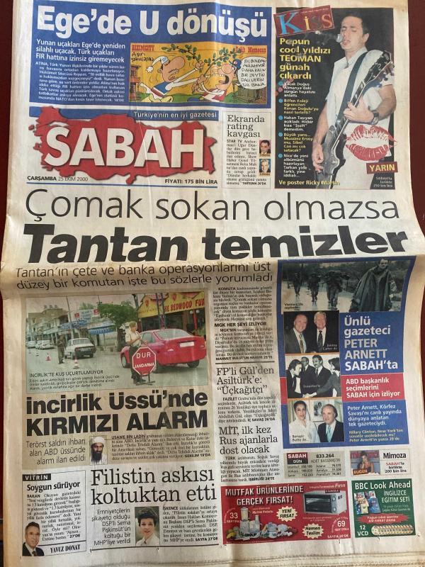 SABAH GAZETESİ DOĞUM GÜNÜ HEDİYESİ - 25 EKİM 2000 - TAM TAKIM 36 SAYFADIR -Teoman-Usame Bin Ladin-Peter Arnett-Ahmet Necdet Sezer-Ali Eren-Scala-Ahmet Dursun-Serdar Bilgili-Şeref Tribünü-Hakan-Suat Kaya-Elvir Boliç-Mustafa Denizli-Mustafa Doğan-Ali Güneş-Nuri Bulak-Avni Aker Ege’de U dönüşü-Çomak sokan olmazsa Tantan temizler-İncirlik Üssü’nde kırmızı alarm-Filistin askısı koltuktan etti-Ünlü gazeteci Peter Arnett Sabah’ta-Gücümüz bu kadar-Kartal çakıldı-Keşke Pascal olsaydı-Hakan’a kanca-Barça 1 puanı uzatmada kurtardı-Beşiktaş sen bizim her şeyimizsin-Baliç kadrodışı-Beni yıkamazlar-Mustafa Doğan ispat ederlerse bırakırım-Avni Aker’de seriye devam Bizimcity-Karikatür-Salih Memecan-Tuncay Özilhan-Ahmet Nazif Zorlu-Temel Atay-Hasan Arat-Sezgin Bayraktar-Ishak Alaton-Mehmet Şuhubi-Hamdi Akın-Zafer Çağlayan-Leyla Şen Şimdi çalışma zamanı-Türkiye ile bizim de ufkumuz açıldı-Karakış bitti bahar başlıyor-En büyük belirsizlik ortadan kalktı-Yönümüzü daha net belirliyoruz-Artık önümüzü gör adlı eser, Kitap > Süreli Yayınlar > Gazeteler > Türkiye > Genel > Günlük kategorisinde İkinci El olarak satıştadır.