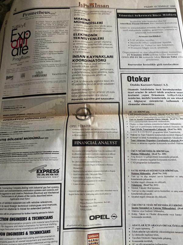 SABAH İŞ PARA İNSAN GAZETESİ DOĞUM GÜNÜ GAZETESİ - 19 TEMMUZ 1998 - Melih Arat-Vizyon2000-Time manager kimdir-107 yıllık borsanın 16 aylık HR departmanı-Zeynep Ulaşan-Etibank-Demirbank-otokar-express kargo-mrm deri konfeksiyon-sales engineer-ilke danışmanlık hizmetleri-Franchise verenler-Mükrime alptekin-Baybars altuntaş-Tınaz Titiz-Finansta kalite-Tuncer Köklü, Dinç Bilgin tarafından kaleme alınmıştır. SABAH İŞ PARA İNSAN GAZETESİ DOĞUM GÜNÜ GAZETESİ - 19 TEMMUZ 1998 - Melih Arat-Vizyon2000-Time manager kimdir-107 yıllık borsanın 16 aylık HR departmanı-Zeynep Ulaşan-Etibank-Demirbank-otokar-express kargo-mrm deri konfeksiyon-sales engineer-ilke danışmanlık hizmetleri-Franchise verenler-Mükrime alptekin-Baybars altuntaş-Tınaz Titiz-Finansta kalite-Tuncer Köklü adlı eser Türkçe dilindedir.