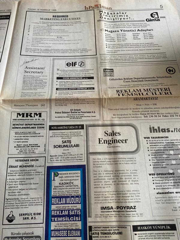 SABAH İŞ PARA İNSAN GAZETESİ DOĞUM GÜNÜ GAZETESİ - 19 TEMMUZ 1998 - Melih Arat-Vizyon2000-Time manager kimdir-107 yıllık borsanın 16 aylık HR departmanı-Zeynep Ulaşan-Etibank-Demirbank-otokar-express kargo-mrm deri konfeksiyon-sales engineer-ilke danışmanlık hizmetleri-Franchise verenler-Mükrime alptekin-Baybars altuntaş-Tınaz Titiz-Finansta kalite-Tuncer Köklü adlı eser, Kitap > Süreli Yayınlar > Gazeteler > Türkiye > Genel > Günlük kategorisinde İkinci El olarak satıştadır.