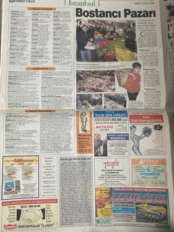 -SABAH İSTANBUL GAZETESİ -23 Aralık 1997 -Erdal Bilallar-İbrahim sarı-Ramazan yazgan-Filiz Güler-Şenol baştakar-Ahmet Çetinsaya-Mehmet Yıldırım-Yılmaz Özdil-Zekeriya Kurumahmutoğlu-Fahrikuz Optik-Combistar-Pimapen-1950’li yıllarda Haliç kıyıları-Liman lokantası-sağlık ocağı tamam sıra kreşe geldi-Dünya gençlik merkezi mağazaları-Kenan erçetingöz- Palermo bebe-liman lokantası Celal Çapa-Serdar canıpek-Naile Akıncı- Bostancı pazarı-nöbetçi eczaneler-rezervasyon-önemli telefonlar-Nemel Kozmetik-Görgülü Pastaneleri-Karmen Konut-Mehmet Sarışın-Önceki gün 96 kişi vefat etti-hediye Cennet’i Mudo Consept-Profiloda kampanya var-mutfakta pratiklik-Johnson’dan ürün atağı-Colin’s Jeans - Fıratpen-İstanbul otomobil kulübü-İstanbul’un her zaman ucuz olan yokuşu Mahmutpaşa-SezenAksu-Uğur Yücel-Candan Erçetin-Müşfik Kenter Meltem cumbul-kadriye Kenter-Levent Güner-Tuncay Aydoğan-Mehmet sarışın-Güngören Belediyesi’nin hatası yüzünden 28 aile günlerdir battaniye altında-dengiz inşaat, DİNÇ BİLGİN tarafından kaleme alınmıştır. -SABAH İSTANBUL GAZETESİ -23 Aralık 1997 -Erdal Bilallar-İbrahim sarı-Ramazan yazgan-Filiz Güler-Şenol baştakar-Ahmet Çetinsaya-Mehmet Yıldırım-Yılmaz Özdil-Zekeriya Kurumahmutoğlu-Fahrikuz Optik-Combistar-Pimapen-1950’li yıllarda Haliç kıyıları-Liman lokantası-sağlık ocağı tamam sıra kreşe geldi-Dünya gençlik merkezi mağazaları-Kenan erçetingöz- Palermo bebe-liman lokantası Celal Çapa-Serdar canıpek-Naile Akıncı- Bostancı pazarı-nöbetçi eczaneler-rezervasyon-önemli telefonlar-Nemel Kozmetik-Görgülü Pastaneleri-Karmen Konut-Mehmet Sarışın-Önceki gün 96 kişi vefat etti-hediye Cennet’i Mudo Consept-Profiloda kampanya var-mutfakta pratiklik-Johnson’dan ürün atağı-Colin’s Jeans - Fıratpen-İstanbul otomobil kulübü-İstanbul’un her zaman ucuz olan yokuşu Mahmutpaşa-SezenAksu-Uğur Yücel-Candan Erçetin-Müşfik Kenter Meltem cumbul-kadriye Kenter-Levent Güner-Tuncay Aydoğan-Mehmet sarışın-Güngören Belediyesi’nin hatası yüzünden 28 aile günlerdir battaniye altında-dengiz inşaat adlı eser Türkçe dilindedir.