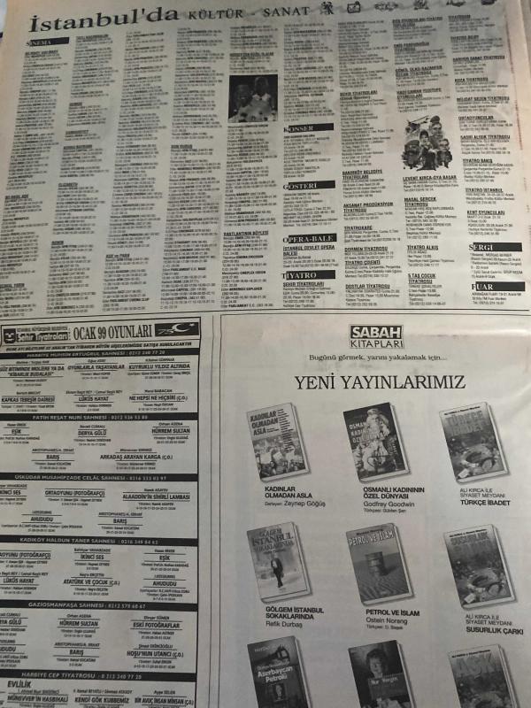 SABAH İSTANBUL GAZETESİ - 23 Aralık 1998- Hava durumu-Erdal Bilallar-Sarı sayfalar-İstanbulda bugün yer alan firmalar-Eczaneler-Sarı sayfalar-İstanbulda kültür ve sanat-Önemli telefonlar-erdal Çetin-baymak kombi-Engin akbaş-Bedrettin dalan-Küçükçekmece-Erenköy-Bayrampaşa-Kadıköy-Bağcılar-Ümraniye-Eyüp-Şişli-Barbaros tamtürk-Taner Göncüler-Okan düzgün-İzmirli kürk Sarayı-Zeynep göğüs-Ramazan Yazgan-Vatan migros’u-boyut otomotiv-üç baba Hasan müzikli oyun-Levent kırca-Oya başar-Aşk memuru-Müjdat gezen tiyatrosu-Hababam Sınıfı-Ferhan Şensoy-ses tiyatrosu-orta oyuncular-sabah kitapları-Ömer bali bey-Celal Çapa-Karagöz Hacivat oyunu-Hatice Aslan-Ertunç Çam-Nermin deliorman-Muzaffer Önal-Ayça Genç-Merve gönder, DİNÇ BİLGİN tarafından kaleme alınmıştır. SABAH İSTANBUL GAZETESİ - 23 Aralık 1998- Hava durumu-Erdal Bilallar-Sarı sayfalar-İstanbulda bugün yer alan firmalar-Eczaneler-Sarı sayfalar-İstanbulda kültür ve sanat-Önemli telefonlar-erdal Çetin-baymak kombi-Engin akbaş-Bedrettin dalan-Küçükçekmece-Erenköy-Bayrampaşa-Kadıköy-Bağcılar-Ümraniye-Eyüp-Şişli-Barbaros tamtürk-Taner Göncüler-Okan düzgün-İzmirli kürk Sarayı-Zeynep göğüs-Ramazan Yazgan-Vatan migros’u-boyut otomotiv-üç baba Hasan müzikli oyun-Levent kırca-Oya başar-Aşk memuru-Müjdat gezen tiyatrosu-Hababam Sınıfı-Ferhan Şensoy-ses tiyatrosu-orta oyuncular-sabah kitapları-Ömer bali bey-Celal Çapa-Karagöz Hacivat oyunu-Hatice Aslan-Ertunç Çam-Nermin deliorman-Muzaffer Önal-Ayça Genç-Merve gönder adlı eser Türkçe dilindedir. Eserin içeriğinde Türkçe dilinde bölümlere de yer verilmektedir.
