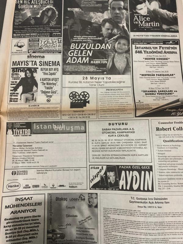 SABAH İSTANBUL GAZETESİ - 23 Mayıs 1999 -erdal Bilallar-filiz Güler-ramazan Yazgan-şenol baştakar-eczaneler-önemli telefonlar-İstanbulluların sesini dinleyin-Sarı Sayfalar-İstanbul’da kültür sanat-Güzellik Rehberi-Selami Öztürk – milyarı süpürüyorlar-hafta sonu yine felç-Mehmet Türk-Adnan SCI-Mustafa Çoban-köprünün iki yanı-bayrağa saygısızlık-ayağınız yere batsın-Erdal Çetin-küstüler-yıkılacak-Engin akbaş-titreşimim kurbanı-Günal-ikiler-modoko-ıdea-bahar stanley-ürofiz-özel estenorm kursu- sen hiç ateşböceği gördün mü-salaklar sofrası-çıplak ten -gençlik festivali, DİNÇ BİLGİN tarafından kaleme alınmıştır. SABAH İSTANBUL GAZETESİ - 23 Mayıs 1999 -erdal Bilallar-filiz Güler-ramazan Yazgan-şenol baştakar-eczaneler-önemli telefonlar-İstanbulluların sesini dinleyin-Sarı Sayfalar-İstanbul’da kültür sanat-Güzellik Rehberi-Selami Öztürk – milyarı süpürüyorlar-hafta sonu yine felç-Mehmet Türk-Adnan SCI-Mustafa Çoban-köprünün iki yanı-bayrağa saygısızlık-ayağınız yere batsın-Erdal Çetin-küstüler-yıkılacak-Engin akbaş-titreşimim kurbanı-Günal-ikiler-modoko-ıdea-bahar stanley-ürofiz-özel estenorm kursu- sen hiç ateşböceği gördün mü-salaklar sofrası-çıplak ten -gençlik festivali adlı eser Türkçe dilindedir.