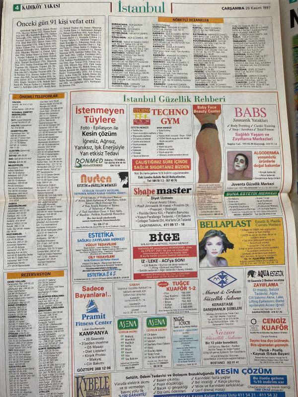SABAH İSTANBUL GAZETESİ -26 Kasım 1997 -Erdal Bilallar-Ramazan yazgan-Filiz Güler-Şenol Bayraktar-avcılar Belediye başkanı Tahsin Salihoğlu-Secaattin Güney-Goldline-Ocean westen-Hamdi türedi-Bülent İpek-Pakpen-Orkapsan-Saniye ergül-birsel Sancar-prestij moda kursu- Dr. Fuat İpekçi-gözde Ufuklar dershanesi önceki gün 91 kişi vefat etti-önemli telefonlar—rezervasyon-nöbetçi eczaneler-İstanbul güzellik rehberi-kiler marketleri-nahit kiler-Aqua estetik-Cengiz Kuaför-Bellaplast-Suna estetik-Babs jimnastik yatak-Bige epilasyon-Shape öastser-Estetika-Asena güzellik salonu-Techno gym-Nurten estetik ve güzellik merkezi-Maestro piyano-Yalçın hipermarket-Küçük papatyalar çocuk evi-uçan balon çocuk evi-Altunizade Çocuk evi-Altınyunus Çocuk evi-petek kaşifler kulübü-mavi boncuk çocuk evi-çöp adam çocuk evi-mavi yunus çocuk evi-Mogano-Can Eser yola-Gökhan karakuş-Öznur fidan, DİNÇ BİLGİN tarafından kaleme alınmıştır. SABAH İSTANBUL GAZETESİ -26 Kasım 1997 -Erdal Bilallar-Ramazan yazgan-Filiz Güler-Şenol Bayraktar-avcılar Belediye başkanı Tahsin Salihoğlu-Secaattin Güney-Goldline-Ocean westen-Hamdi türedi-Bülent İpek-Pakpen-Orkapsan-Saniye ergül-birsel Sancar-prestij moda kursu- Dr. Fuat İpekçi-gözde Ufuklar dershanesi önceki gün 91 kişi vefat etti-önemli telefonlar—rezervasyon-nöbetçi eczaneler-İstanbul güzellik rehberi-kiler marketleri-nahit kiler-Aqua estetik-Cengiz Kuaför-Bellaplast-Suna estetik-Babs jimnastik yatak-Bige epilasyon-Shape öastser-Estetika-Asena güzellik salonu-Techno gym-Nurten estetik ve güzellik merkezi-Maestro piyano-Yalçın hipermarket-Küçük papatyalar çocuk evi-uçan balon çocuk evi-Altunizade Çocuk evi-Altınyunus Çocuk evi-petek kaşifler kulübü-mavi boncuk çocuk evi-çöp adam çocuk evi-mavi yunus çocuk evi-Mogano-Can Eser yola-Gökhan karakuş-Öznur fidan adlı eser Türkçe dilindedir.