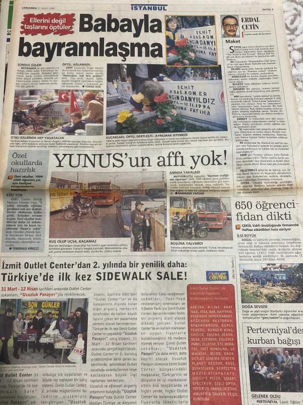 SABAH İSTANBUL GAZETESİ - 31 Mart 1999 -erdal Bilallar-filiz Güler-ramazan Yazgan-şenol baştakar-eczaneler-önemli telefonlar-İstanbulluların sesini dinleyin-Sarı Sayfalar-İstanbul’da kültür sanat-Güzellik Rehberi-erdal Çetin-babayla bayramlaşma-Yüksel Koç-Şehit komando Engin danyıldız Emin Sungur-Sadettin Tantan-Eminkul-Zekeriya temizel-Adnan Polat-İdris akyüz-Mehmet Ayan-Çelik-İslam koray-Mehmet Bingöl-battal İlgezdi-Ali talip Özdemir-Pendik oscar sinemaları- movieplex-sen hiç ateşböceği gördün mü- aşk memuru-helikopter- şen makas-vampirler-popcorn-acaba hangisi-nejat uygur-kaynanatör- üç baba hasan-levent kırca-oya başar-peter pan adlı eser, Kitap > Süreli Yayınlar > Gazeteler > Türkiye > Genel > Günlük kategorisinde İkinci El olarak satıştadır.