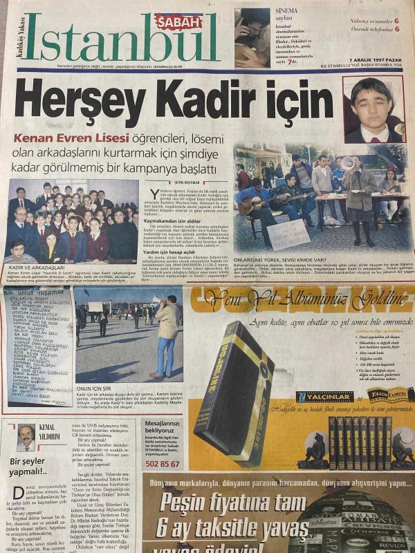 SABAH İSTANBUL GAZETESİ -7 Aralık 1997 -Erdal Bilallar-Ramazan yazgan-Filiz Güler-Şenol Bayraktar-Kenan Evren Lisesi öğrencileri, Lösemi olan arkadaşlarını kurtarmak için şimdiye kadar görülmemiş bir kampanya başlattı-her şey Kadir için-Kemal Yıldırım-mavi bisiklet Çocuk kulübü-Pamukspor merkezi-kiralık Noel baba—nebahat Koç-mimar muammer bayır-Sevgi Yazıcı-Rugstore-Carousel ışıl ışıl-Eyüboğlu Lisesi-Binali Yıldırım-Euro klinik laboratuvarı-Ondor arpets-Carrefour farkı-Özbağ pardesü-rüstem eyüboğlu-İstanbul otomobil kulübü-nöbetçi eczaneler-önemli telefonlar rezervasyon-prestige moda kursu-Bahçekent kooperatifler-Artem mobilya-james bond-Özkan binol-çelik-cihan Ünal-Berna Laçim-Cem davran-Esra Akkaya--İlker güler-raydolap-Modisan-Stanley, DİNÇ BİLGİN tarafından kaleme alınmıştır. SABAH İSTANBUL GAZETESİ -7 Aralık 1997 -Erdal Bilallar-Ramazan yazgan-Filiz Güler-Şenol Bayraktar-Kenan Evren Lisesi öğrencileri, Lösemi olan arkadaşlarını kurtarmak için şimdiye kadar görülmemiş bir kampanya başlattı-her şey Kadir için-Kemal Yıldırım-mavi bisiklet Çocuk kulübü-Pamukspor merkezi-kiralık Noel baba—nebahat Koç-mimar muammer bayır-Sevgi Yazıcı-Rugstore-Carousel ışıl ışıl-Eyüboğlu Lisesi-Binali Yıldırım-Euro klinik laboratuvarı-Ondor arpets-Carrefour farkı-Özbağ pardesü-rüstem eyüboğlu-İstanbul otomobil kulübü-nöbetçi eczaneler-önemli telefonlar rezervasyon-prestige moda kursu-Bahçekent kooperatifler-Artem mobilya-james bond-Özkan binol-çelik-cihan Ünal-Berna Laçim-Cem davran-Esra Akkaya--İlker güler-raydolap-Modisan-Stanley adlı eser Türkçe dilindedir.