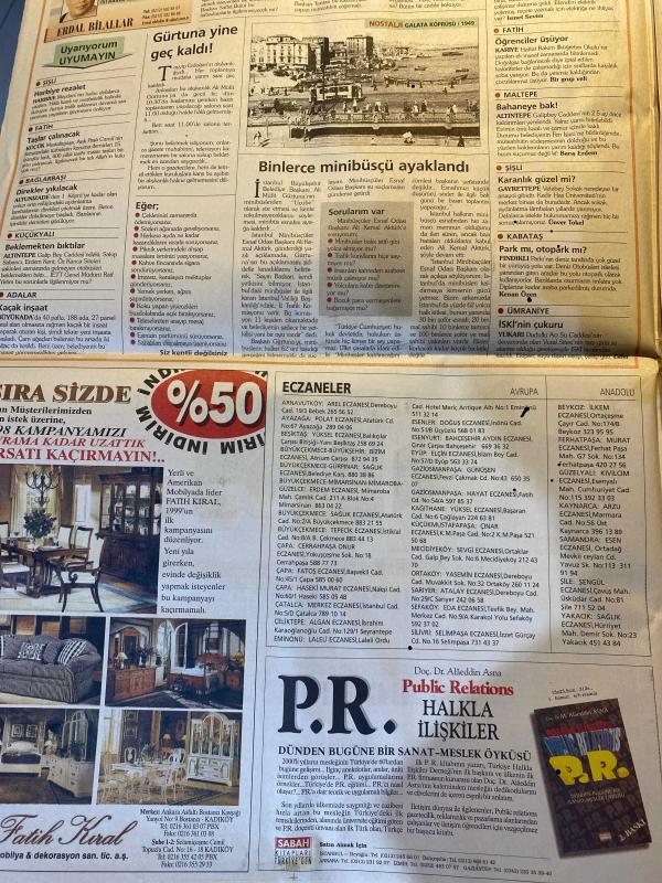 SABAH İSTANBUL GAZETESİ - 9 Ocak 1999 -Esmer mobilya-fatih- şişli- ümraniye-maltepe-public relations-fatih kural-gömme dolap-kontakt lens-ece pen-kuzey teknik-eksa şirketler grubu-pendik akşam lisesi- sarı sayfalar- eti bank-serdar ortaç-tutku-metin arolat- aydın-batuğ-kenan doğulu-izmirli kürk sarayı-zümrüt inşaat-as ayakkabı-hergün eğitim merkezi-kurtoğlu çelik kapı-emka-çifa deri-Salim yavaşoğlu-Zafer-Kenan Özen-Ünver tokel-Barış Erdem-İsmet Sevim-dört tekerlekli bombalar-copten oyun bahçesi-gaspçı korkusu-Galata-500 öğrenciye burs, DİNÇ BİLGİN tarafından kaleme alınmıştır. SABAH İSTANBUL GAZETESİ - 9 Ocak 1999 -Esmer mobilya-fatih- şişli- ümraniye-maltepe-public relations-fatih kural-gömme dolap-kontakt lens-ece pen-kuzey teknik-eksa şirketler grubu-pendik akşam lisesi- sarı sayfalar- eti bank-serdar ortaç-tutku-metin arolat- aydın-batuğ-kenan doğulu-izmirli kürk sarayı-zümrüt inşaat-as ayakkabı-hergün eğitim merkezi-kurtoğlu çelik kapı-emka-çifa deri-Salim yavaşoğlu-Zafer-Kenan Özen-Ünver tokel-Barış Erdem-İsmet Sevim-dört tekerlekli bombalar-copten oyun bahçesi-gaspçı korkusu-Galata-500 öğrenciye burs adlı eser Türkçe dilindedir.