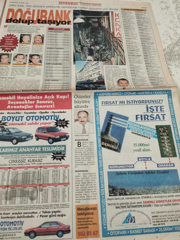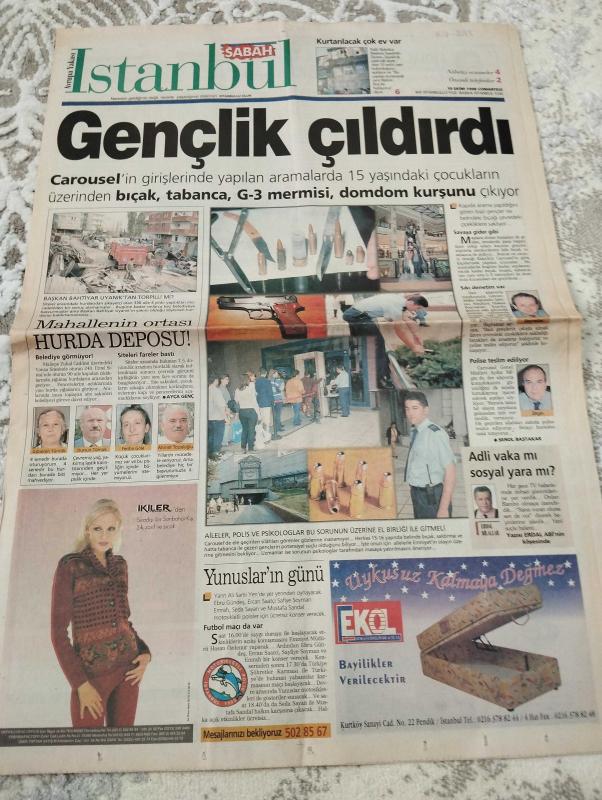 SABAH İSTANBUL GAZETESİ AVRUPA YAKASI GAZETESİ - 10 Ekim 1998- gençlik çıldırdı-carousel- Aydın bilgin-şenol başta karısı çizgi Erdal Bilaller- gülseren türnük-dursun türnük- feriha Göle-ahmet topaloğlu- Ayça genç- Hilal Yılmaz- önemli telefonlar-ayşegül ger kuş-hasan tunç-hüseyin yılmaz-irfan Gülşen- ramazan yazgan-futbol sahası çöplük oldu- her şey vatan için- sarraf Niyazi- muammer yüksel-süleyman kiraz-haluk tablacıoğlu- hüseyin akgün-necdet babataşı- Doğu Bank dolup taşıyor- Vedat babataş- Ömer Faruk Aydın-Ekol-prestij-çamlik sitesi-rugstore-tempo-pendik-binkanat mobilya- başhan parke-boyut motorlu taşıtlar-akçasan- eksa şirketler grubu adlı eser, Kitap > Süreli Yayınlar > Gazeteler > Türkiye > Genel > Günlük kategorisinde İkinci El olarak satıştadır.