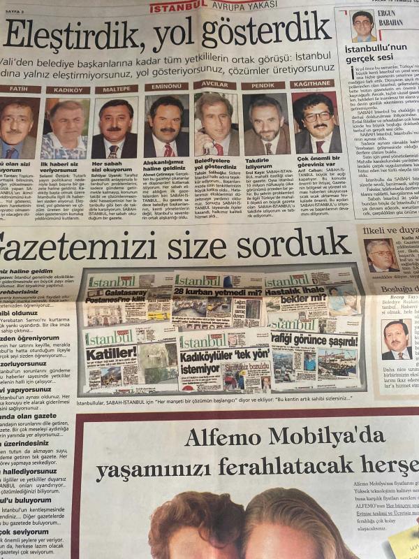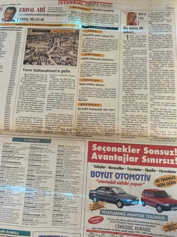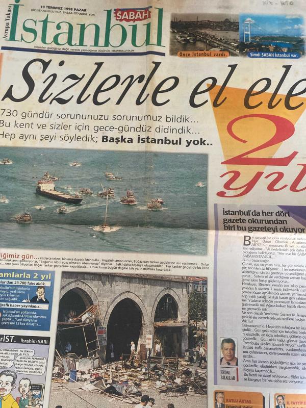 SABAH İSTANBUL GAZETESİ AVRUPA YAKASI GAZETESİ - 19 Temmuz 1998 -İbrahim sarı-hıncal Uluç-Rauf Tamer-Ergun Babahan-Yılmaz Özdil-Kemal Yıldırım-Kutlu Aktaş-Recep Tayyip Erdoğan-Erdal Bilallar-tarihi Mısır Çarşısı’nda patlama-Yerebatan ve Ayasofya‘yı kurtaralım-eczaneler-boyut otomotiv-gözen yaz okulu-Erol Kaya-Ahmet Çetinkaya-bahtiyar uyanık-Selami Öztürk-Sadettin Tantan-Arif Çalban-Baymar hipermarket-Celal Ramazanoğulları-Vedat Kabataş‘ı-İlyas Günay-Faruk darende-Mithat yümlü-Kemal Yıldırım-Kayahan-Metin Şentürk-Fehmi Çetinkaya-esmer mobilya-Fahri kuzu optik-Mustafa Taviloğlu-hulki aktunç-Egepen, DİNÇ BİLGİN tarafından kaleme alınmıştır. SABAH İSTANBUL GAZETESİ AVRUPA YAKASI GAZETESİ - 19 Temmuz 1998 -İbrahim sarı-hıncal Uluç-Rauf Tamer-Ergun Babahan-Yılmaz Özdil-Kemal Yıldırım-Kutlu Aktaş-Recep Tayyip Erdoğan-Erdal Bilallar-tarihi Mısır Çarşısı’nda patlama-Yerebatan ve Ayasofya‘yı kurtaralım-eczaneler-boyut otomotiv-gözen yaz okulu-Erol Kaya-Ahmet Çetinkaya-bahtiyar uyanık-Selami Öztürk-Sadettin Tantan-Arif Çalban-Baymar hipermarket-Celal Ramazanoğulları-Vedat Kabataş‘ı-İlyas Günay-Faruk darende-Mithat yümlü-Kemal Yıldırım-Kayahan-Metin Şentürk-Fehmi Çetinkaya-esmer mobilya-Fahri kuzu optik-Mustafa Taviloğlu-hulki aktunç-Egepen adlı eser Türkçe dilindedir. Eserin içeriğinde Türkçe dilinde bölümlere de yer verilmektedir.