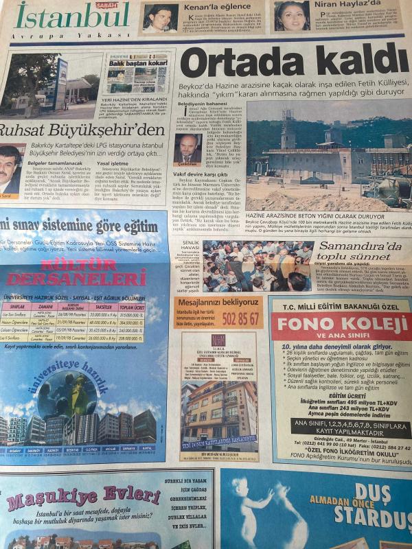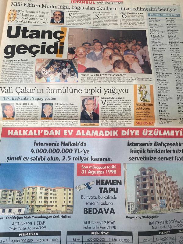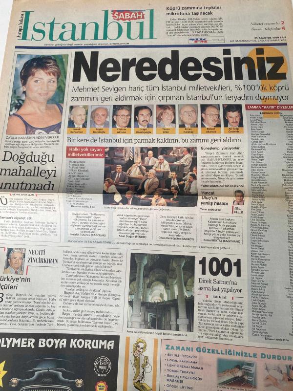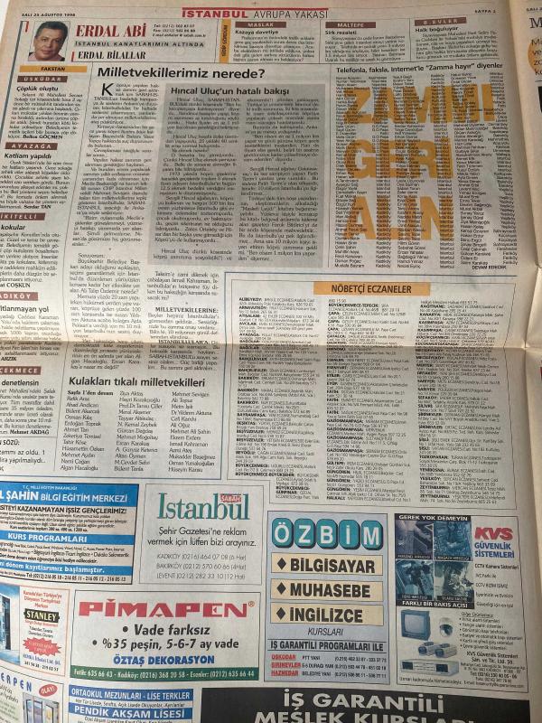 SABAH İSTANBUL GAZETESİ AVRUPA YAKASI GAZETESİ - 25 Ağustos 1998 -Kemal Yıldırım-Erdal Bilallar-Şenol Baştakar-Fakstan-Şikayet-nöbetçi eczaneler-Rezervasyon-Önemli Telefonlar-baymak kombi-Alarko kombi-Sibel Can okula babasının adını verecek-Necdet tütüncü-Sibel Doğan-Orhan Demir öğütten-Kemal Bektaş-zamma hayır diyenler-Haluk dağ-Necati zincirkıran-İsmail kahraman-Yıldırım Aktuna-Ercan karakaş-Ali talip Özdemir-Tansu Çiller-algan hacaloğlu-Hayri Kozakçıoğlu-Bülent akarcalı-Polymer-üsküdar-İkitelli-Kadıköy-Küçükçekmece-Maltepe-Maslak-Özel Şahin Bilge eğitim merkezi-Pendik akşam Lisesi-Altunbaşlar inşaat-bedrettin Dalan-vali Erol Çakır-milli eğitim müdürü Ömer balıbey-Osman Saral-Yücel Çelikbilek-Samandıra Belediyesi-Burhan Çaçan-İsmail Türüt-Maşukiye evleri-Kenan doğulu- Niran Ünsal adlı eser, Kitap > Süreli Yayınlar > Gazeteler > Türkiye > Genel > Günlük kategorisinde İkinci El olarak satıştadır.
