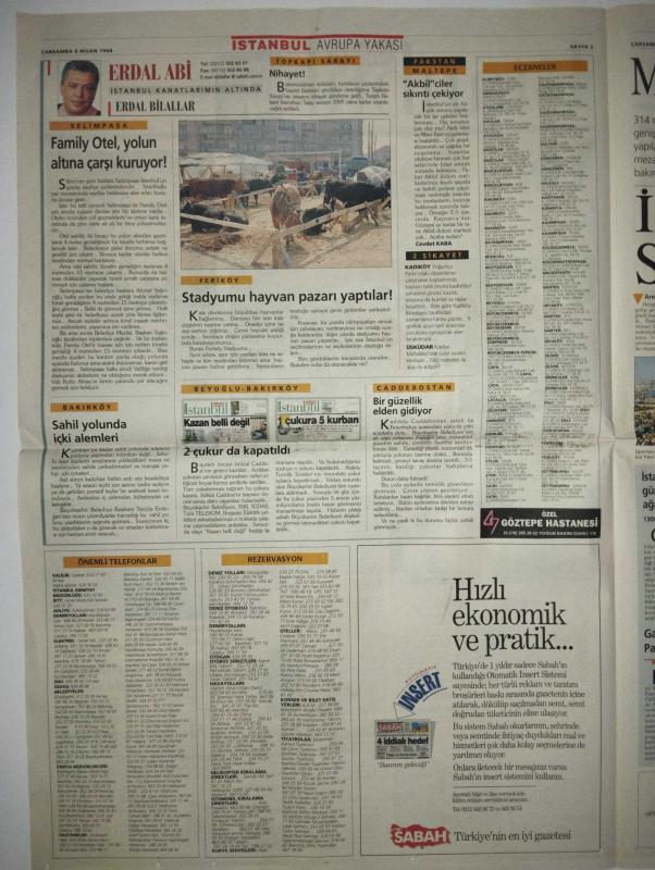 SABAH ISTANBUL GAZETESI DOĞUM GÜNÜ GAZETESI -8 Nisan 1998-Mehmet Sekmen-Orhan Tanyeri-Erdal Aktaş-İbrahim Sarı-Mehmet Balyan-Sibel Baştürk-Rukiye Yalçın-Nurettin Ayaz-Meral Tahmaz-Bekir Balyan-Şenol Baştakar-Sarah Bradford-Kenan Orman-Kenan Şen-Bekir Babayev-Ayşe Turhan-Yılmaz Özdil-Erdal Akbiçak Yeni Sekmen-Okuma bayramı-Stadyumu hayvan pazarı yaptılar-Atatürk büstünü görmemek için belediye binasına giriş kapısını değiştirdi-Türk bayrağına bir saygısızlık daha-Köyün merasını ihaleyle verdiği firma çimleri kazıyarak sattı-Bir okula karşı 5 cami 2 kuran kursu 1 külliye-Pencereyi tuğla ile kapattı-Kanalizasyonlar sokağa akıyor-Bir başka talan daha-Bu yer Bolluca Belediyesi’ne aittir-İnsan seli-Mezarlıklar pırıl pırıl olacak-Family Otel yolun altına çatı kuruyor-Stadyumu hayvan pazarı yaptılar-Bahtiyar etti-Hızlı ekonomik ve pratik-Eğlence dorukta-Kumlar ve taşlar arasında bayram-İSKİ’nin ayıbı-İtalya’dan mermer getiriliyor-Terkos Gölü Karadeniz ile birleşiyor-El bombası çakmak-Karanfill adlı eser Türkçe dilindedir. Eserin içeriğinde Türkçe dilinde bölümlere de yer verilmektedir.