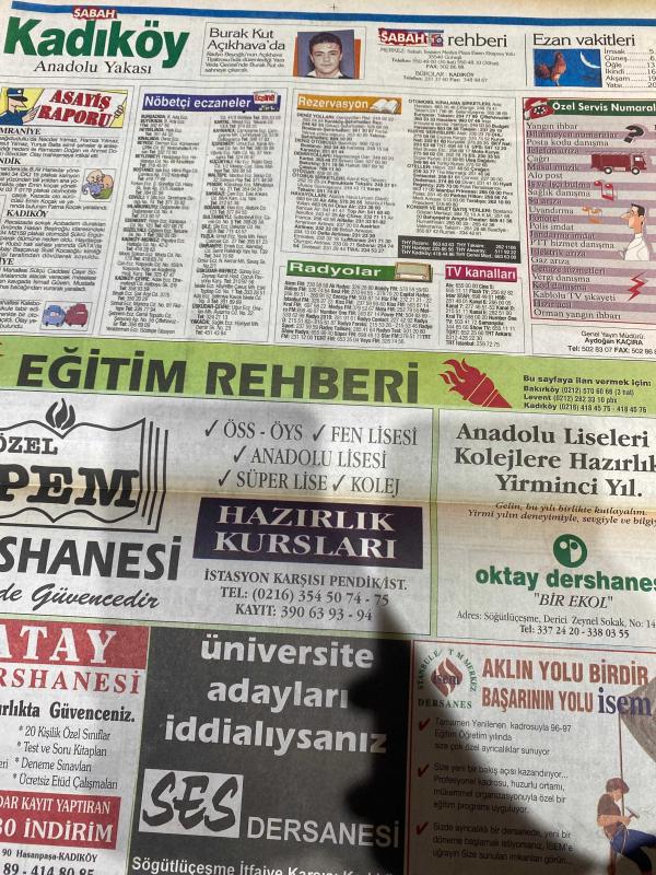 SABAH İSTANBUL GAZETESİ KADIKÖY ANADOLU YAKASI GAZETESİ - 24 Eylül 1997 -Erdal Bilallar-Kemal Yıldırım-Özel Servis Numaraları-Radyolarımız-Nöbetçi eczaneler-Sinema-Önemli Telefonlar-Rezervasyon-Asayiş Raporu-Ezan Vakitleri-Pinokyo-kontakt lens lens club-starduş-pimapen-afacanlar sirki-o da bir ana-helen mırren-ındependence day-otostop-Erıcsson-gözen ön lisans kursları-çöp adam çocuk evi-petek çocuk evi-kadıköy özel prestij giyim modelist-Özel şahin bilgi eğitim sistemi-İstanbul lisan merkezi-Özlem Özakova-Fahri Kuz Optik-Belgin Atmaca-Can Esen-Recep Tayyip erdoğan-Muhittin soğukoğlu-Lasalle-özel klas dershanesi-Asım Arsoy-Sevda demirel-Engin Koç-Salih güney-Cem yılmaz-pem dershanesi-oktay dershanesi-Batı dilleri merkezi-Burak kut adlı eser, Kitap > Süreli Yayınlar > Gazeteler > Türkiye > Genel > Günlük kategorisinde İkinci El olarak satıştadır.