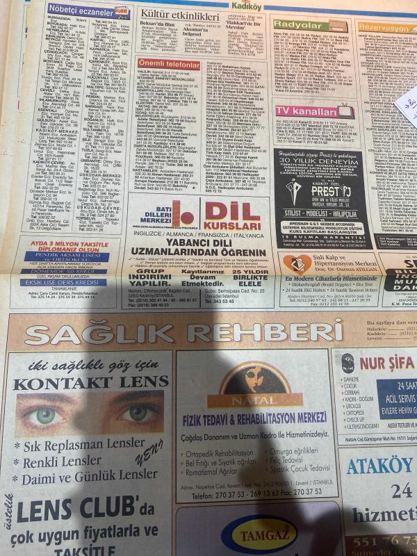 SABAH İSTANBUL GAZETESİ KADIKÖY ANADOLU YAKASI GAZETESİ - 4 Ekim 1996 -Erdal Bilallar-Kemal Yıldırım-Özel Servis Numaraları-Radyolarımız-Nöbetçi eczaneler-Sinema-Önemli Telefonlar-Rezervasyon-Asayiş Raporu-Ezan Vakitleri-Lotus Jeans-Avusturalya Charles Sturt Devlet Üniversitesi-Mezarlıklar Müdürü Celal Sevencan-Kağıthane Belediye Başkanı Arif Calban-Gülnur Yeşilbaş-Büyükada-Bahçelievler-Aksaray-baymak kombi-Seren Mefruşat-Nur Şifa Merkezi-Lens Club-Ataköy Kliniği-Otostop-Ramiz ve Julide-Sinema dergisi-Cem Yımaz-O Da Bir Ana-Pendik-Bayrampaşa-Esenler-Eminönü-Ayhan Gülmez-Sami Kuru-Balkon ödüllendirmesi-Atay dershanesi-Poseidon Restaurant adlı eser, Kitap > Süreli Yayınlar > Gazeteler > Türkiye > Genel > Günlük kategorisinde İkinci El olarak satıştadır.