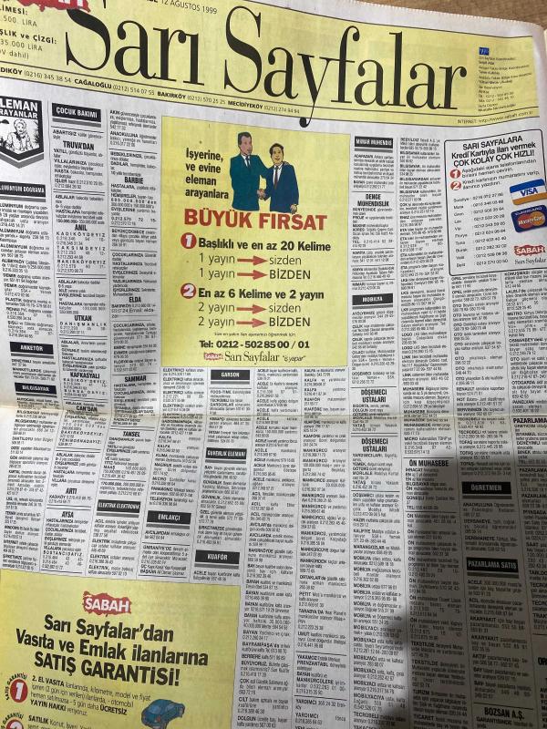 SABAH İSTANBUL GAZETESİ SABAH MELODİ GAZETESİ - 12 Ağustos 1999 - Erdal Bilallar-Eczaneler-Güzellik Rehberi-Sağlık Rehberi-Sabah Sarı Sayfalar-Şenol Baştakar-İstanbulluların dert köşesi-İstanbul’da Kültür Sanat-ŞENOL BAŞTAKAR-Yavuz asdemir-Mustafa değirmenci-Vatan bilgisayar-acer-Üroklinik-Spor’99-Bellaplast-Selena estetik zayıflama-pıt tedavisi-Erdal Çetin-AB Shaper-Selena estetik zayıflama-Göz protez laboratuvarı-Gürtuna-Erdal çetin-Ramazan Yazgan-Lazermed-Engin Akbaş-Goran Bregoviç-Merhaba yoldaş-Sezen aksu-Virüs-Mustafa Sarıgül-Tuna huş-Faik semim-Mustafa Öztürk adlı eser, Kitap > Süreli Yayınlar > Gazeteler > Türkiye > Genel > Günlük kategorisinde İkinci El olarak satıştadır.