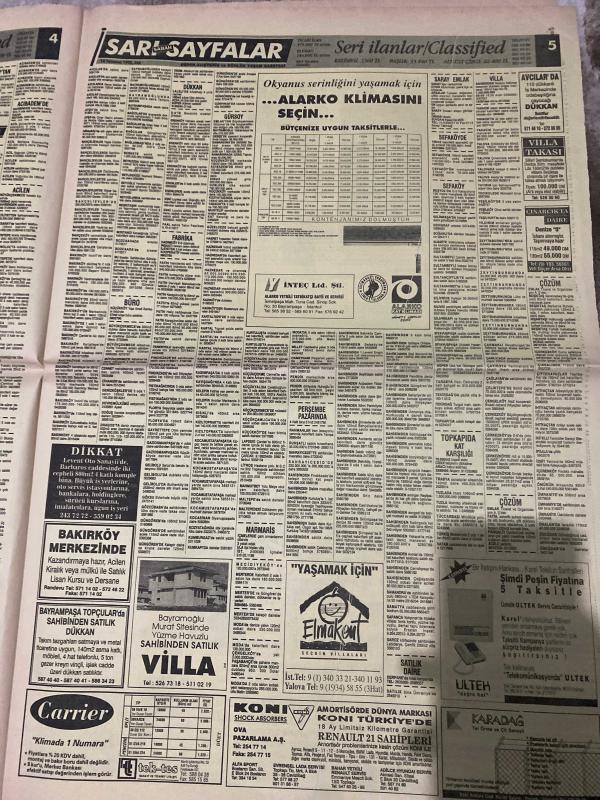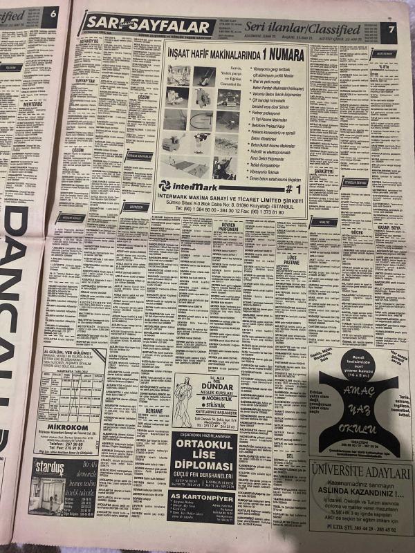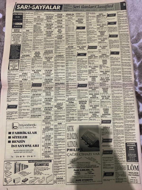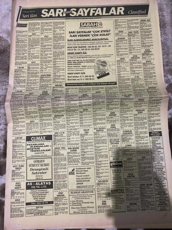 SABAH İSTANBUL ÖZEL SERİ İLAN SARI SAYFALAR DOĞUM GÜNÜ GAZETESİ - 14 TEMMUZ 1992 - Climax-Gökşen Sürücü kursu -As alataş-dost oto-güden-kinetiks-güney yapı ve turizm-hyundai karoto -Mıtsubıshı-herkese bir otomobil-tofaş-Alarko klimasınız seçin-Bakırköy Merkezinde-kariyer-villa-yaşamak için-koni-Karadağ-Termekz elektro şofben-faks-iki span PVC plastik pencere sistemi Sanayi ve ticaret-seren ahşap dekorasyon-sena-çağdaş teknoloji ile şimdi tanışın fırsat kaçırmadığınız-ekin iletişim hizmetleri-löm ingilizce yaz kursu-bye-Philips-Sınırtaş- adlı eser, Kitap > Süreli Yayınlar > Gazeteler > Türkiye > Genel > Günlük kategorisinde İkinci El olarak satıştadır.