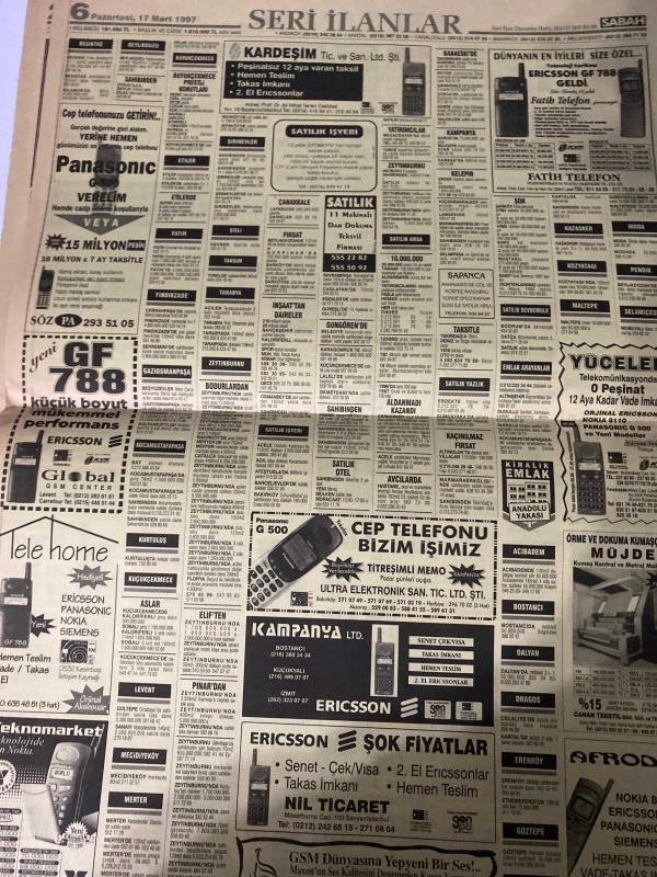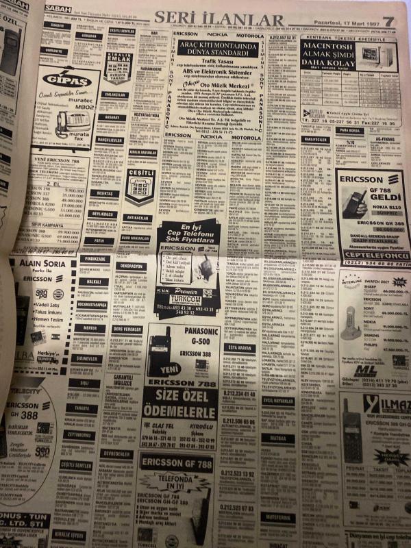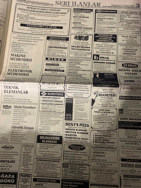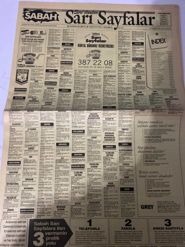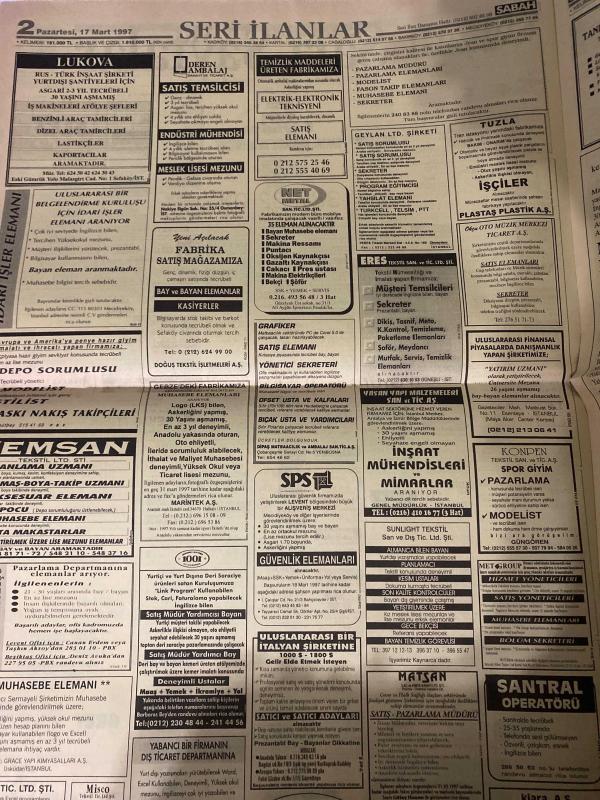 SABAH İSTANBUL ÖZEL SERİ İLAN SARI SAYFALAR DOĞUM GÜNÜ GAZETESİ - 17 MART 1997 -sigorta-garson-mobilya-kuaför-Çocuk bakım-emlakçı-sağlık-tahsilatçı-şoför-temizlik elemanı-tezgahtar-tornacı-kasap-pastane-muhasebe-Beşiktaş-Beykoz-Alibeyköy-Bağcılar-Bakırköy-Gayrettepe-laleli-Levent-Gaziosmanpaşa-Fatih-Beşiktaş-Fındıkzade-Küçükçekmece-Ortaköy-Florya-Fulya- Üsküdar-Göztepe-Bağlarbaşı-Ataşehir-Yalova-Tuzla-Avcılar-Ulus-Merter-Anadoluhisarı-Tarabya-Sefaköy-yakacık-Suadiye-moda-kazasker-Maltepe-Kartal-grey-pakpen-Cemsan Tekstil-uluslararası finans kuruluşu-elit dış ticaret-sunlıght tekstil-Kompen Tekstil-net metal-deren ambalaj-LC Waikiki fetih Tekstil-Hepcanlar Tekstil-teks-saray mağazası-Eda telekom-Marmara telekom-kıroğlu elektronik-sentez haberleşme-İstanbul Elektronik-Gürses-Şamiloğlu Elektronik-Nil ticaret-Yaman Teknomark-Canan Tekstil-Güngör Elektronik- Yılmaz ithalat-Kutlu bilişim-engin makina-master otomotiv adlı eser, Kitap > Süreli Yayınlar > Gazeteler > Türkiye > Genel > Günlük kategorisinde İkinci El olarak satıştadır.