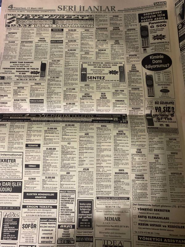 SABAH İSTANBUL ÖZEL SERİ İLAN SARI SAYFALAR DOĞUM GÜNÜ GAZETESİ - 17 MART 1997 -sigorta-garson-mobilya-kuaför-Çocuk bakım-emlakçı-sağlık-tahsilatçı-şoför-temizlik elemanı-tezgahtar-tornacı-kasap-pastane-muhasebe-Beşiktaş-Beykoz-Alibeyköy-Bağcılar-Bakırköy-Gayrettepe-laleli-Levent-Gaziosmanpaşa-Fatih-Beşiktaş-Fındıkzade-Küçükçekmece-Ortaköy-Florya-Fulya- Üsküdar-Göztepe-Bağlarbaşı-Ataşehir-Yalova-Tuzla-Avcılar-Ulus-Merter-Anadoluhisarı-Tarabya-Sefaköy-yakacık-Suadiye-moda-kazasker-Maltepe-Kartal-grey-pakpen-Cemsan Tekstil-uluslararası finans kuruluşu-elit dış ticaret-sunlıght tekstil-Kompen Tekstil-net metal-deren ambalaj-LC Waikiki fetih Tekstil-Hepcanlar Tekstil-teks-saray mağazası-Eda telekom-Marmara telekom-kıroğlu elektronik-sentez haberleşme-İstanbul Elektronik-Gürses-Şamiloğlu Elektronik-Nil ticaret-Yaman Teknomark-Canan Tekstil-Güngör Elektronik- Yılmaz ithalat-Kutlu bilişim-engin makina-master otomotiv, DİNÇ BİLGİN tarafından kaleme alınmıştır. SABAH İSTANBUL ÖZEL SERİ İLAN SARI SAYFALAR DOĞUM GÜNÜ GAZETESİ - 17 MART 1997 -sigorta-garson-mobilya-kuaför-Çocuk bakım-emlakçı-sağlık-tahsilatçı-şoför-temizlik elemanı-tezgahtar-tornacı-kasap-pastane-muhasebe-Beşiktaş-Beykoz-Alibeyköy-Bağcılar-Bakırköy-Gayrettepe-laleli-Levent-Gaziosmanpaşa-Fatih-Beşiktaş-Fındıkzade-Küçükçekmece-Ortaköy-Florya-Fulya- Üsküdar-Göztepe-Bağlarbaşı-Ataşehir-Yalova-Tuzla-Avcılar-Ulus-Merter-Anadoluhisarı-Tarabya-Sefaköy-yakacık-Suadiye-moda-kazasker-Maltepe-Kartal-grey-pakpen-Cemsan Tekstil-uluslararası finans kuruluşu-elit dış ticaret-sunlıght tekstil-Kompen Tekstil-net metal-deren ambalaj-LC Waikiki fetih Tekstil-Hepcanlar Tekstil-teks-saray mağazası-Eda telekom-Marmara telekom-kıroğlu elektronik-sentez haberleşme-İstanbul Elektronik-Gürses-Şamiloğlu Elektronik-Nil ticaret-Yaman Teknomark-Canan Tekstil-Güngör Elektronik- Yılmaz ithalat-Kutlu bilişim-engin makina-master otomotiv adlı eser Türkçe dilindedir.