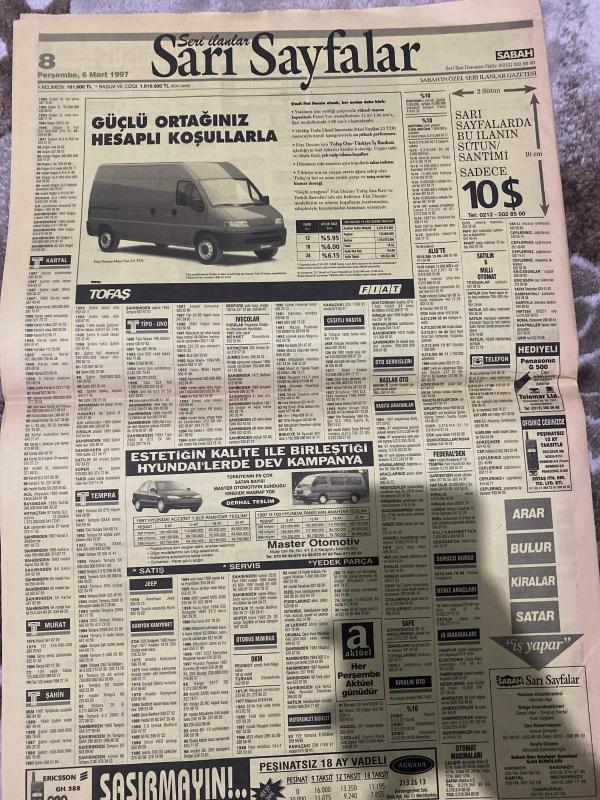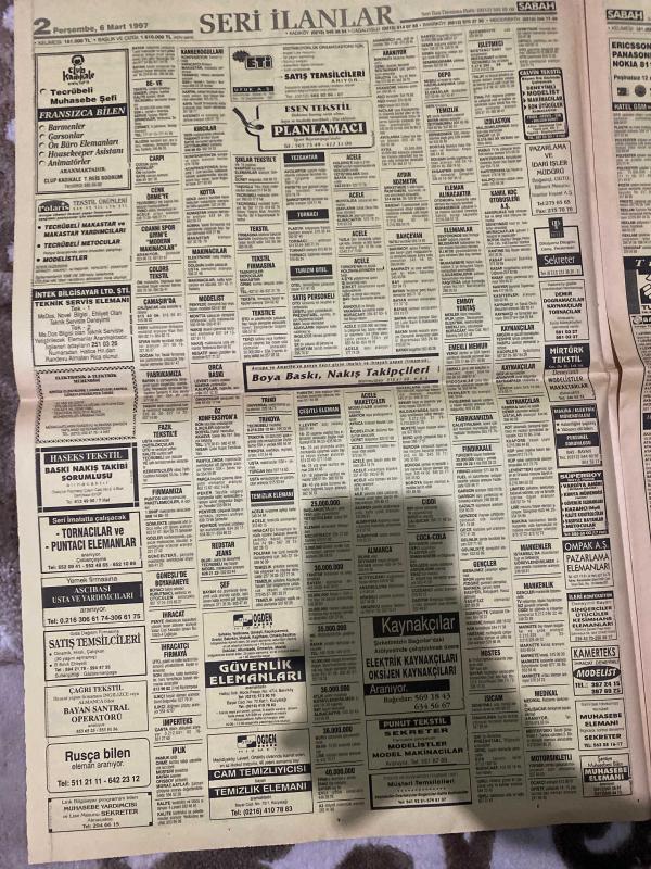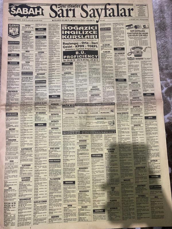 SABAH İSTANBUL ÖZEL SERİ İLAN SARI SAYFALAR DOĞUM GÜNÜ GAZETESİ - 6 MART 1997 - Boğaziçi İngilizce kuşları-başlangıç orta ileri çeviri KPDS TOEFL-Eleman arayanlar-emlakçı-garson-pazarlama- sarı sayfalara kredi kartıyla ilan vermek çok kolay çok hızlı-tecrübeli muhasebe şefi-Fransızca bilen-esen tekstil-planlamacı-tezgahtar-tornacı-turizm otel-Ntek bilgisayar-teknik servis elemanı-boya baskı-nakış takipçileri-baskı nakış takibi Sorumlusu-Tornacılar ve Puntacı elemanlar-aşçıbaşı usta ve yardımcıları- satış temsilcileri-güvenlik elemanları-Kaynakçılar-Fatih telefon-en iyi fiyata en iyi cep telefonu-çağrı-en iyi cep telefonu şok fiyatlara-Yılmaz-İhraç fazlası satışları-Özel bilSof-sarı sayfalarda bu ilanı sütün santimi sadece 10 $-emekliler-Şile‘de ayrıcalıklı bir yaşam-sahibinden satılık dükkan ve işyerleri-yatırımcılar-Tesan-Çatalca kabakça köyü nde-Yeşilköyde-sahibinden satılık daireler ve arsalar-mimar Sinan-sorunsuz iletişim için doğru adres-arayın görüşelim-çağı telekom-kiralık e, DİNÇ BİLGİN tarafından kaleme alınmıştır. SABAH İSTANBUL ÖZEL SERİ İLAN SARI SAYFALAR DOĞUM GÜNÜ GAZETESİ - 6 MART 1997 - Boğaziçi İngilizce kuşları-başlangıç orta ileri çeviri KPDS TOEFL-Eleman arayanlar-emlakçı-garson-pazarlama- sarı sayfalara kredi kartıyla ilan vermek çok kolay çok hızlı-tecrübeli muhasebe şefi-Fransızca bilen-esen tekstil-planlamacı-tezgahtar-tornacı-turizm otel-Ntek bilgisayar-teknik servis elemanı-boya baskı-nakış takipçileri-baskı nakış takibi Sorumlusu-Tornacılar ve Puntacı elemanlar-aşçıbaşı usta ve yardımcıları- satış temsilcileri-güvenlik elemanları-Kaynakçılar-Fatih telefon-en iyi fiyata en iyi cep telefonu-çağrı-en iyi cep telefonu şok fiyatlara-Yılmaz-İhraç fazlası satışları-Özel bilSof-sarı sayfalarda bu ilanı sütün santimi sadece 10 $-emekliler-Şile‘de ayrıcalıklı bir yaşam-sahibinden satılık dükkan ve işyerleri-yatırımcılar-Tesan-Çatalca kabakça köyü nde-Yeşilköyde-sahibinden satılık daireler ve arsalar-mimar Sinan-sorunsuz iletişim için doğru adres-arayın görüşelim-çağı telekom-kiralık e adlı eser Türkçe dilindedir.