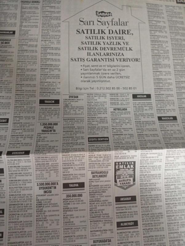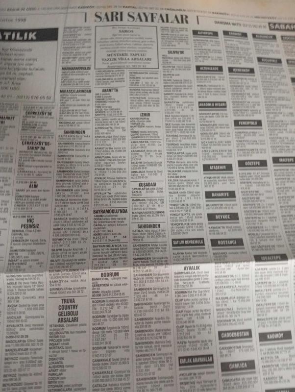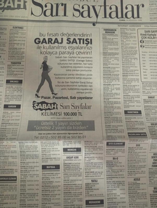 SABAH İSTANBUL ÖZEL SERİ SARI SAYFALAR DOĞUM GÜNÜ GAZETESİ - 14 ağustos 1998 - sigorta-garson-mobilya-kuaför-Çocuk bakım-emlakçı-sağlık-tahsilatçı-şoför-temizlik elemanı-tezgahtar-tornacı-kasap-pastane-muhasebe-Beşiktaş-Beykoz-Alibeyköy-Bağcılar-Bakırköy-Gayrettepe-laleli-Levent-Gaziosmanpaşa-Fatih-Beşiktaş-Fındıkzade-Küçükçekmece-Ortaköy-Florya-Fulya- Üsküdar-Göztepe-Bağlarbaşı-Ataşehir-Yalova-Tuzla-Avcılar-Ulus-Merter-Anadoluhisarı-Tarabya-Sefaköy-yakacık-Suadiye-moda-kazasker-Maltepe-Kartal-Kalamış-Kadıköy-bostancı-akatlar Mecidiyeköy-Kocamustafapaşa-Çamlıca-Koşuyolu-Pendik-Kozyatağı-Ford-Mercedes-Citroen-BMW-Mazda-Kartal-Renault-Opel-Nissan-Mitsubishi-Kartal-Tempra-Doğan-Şahin-Murat-ipaş-mata mobilya-kara fırın-ultra tekstil-gima-dayson Max ınternational-ihlas kargo-ülker-akkanat holding-rapido tekstil-marina dış ticaret-telephone shop adlı eser, Kitap > Süreli Yayınlar > Gazeteler > Türkiye > Genel > Günlük kategorisinde İkinci El olarak satıştadır.
