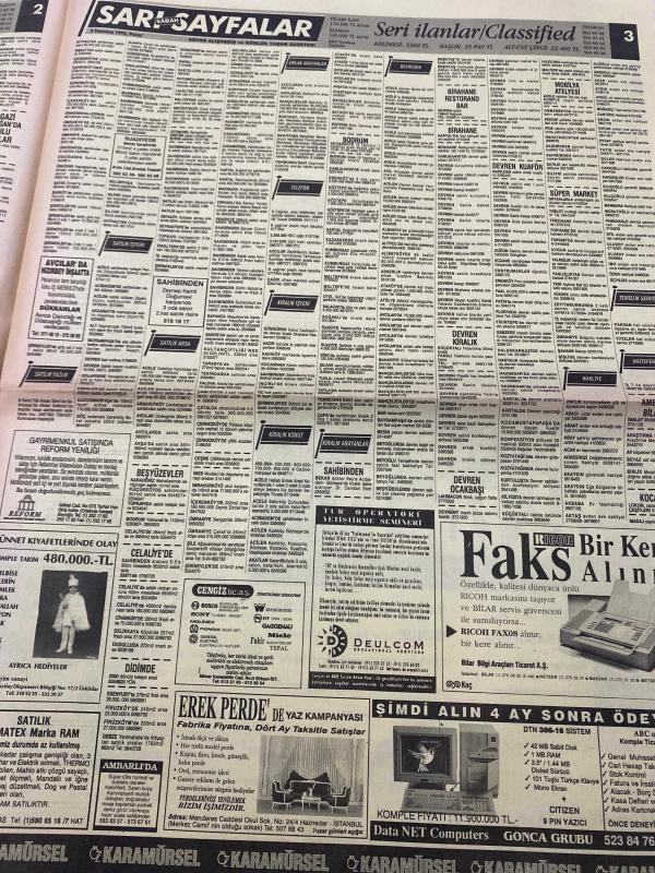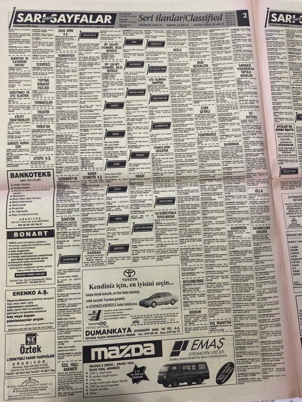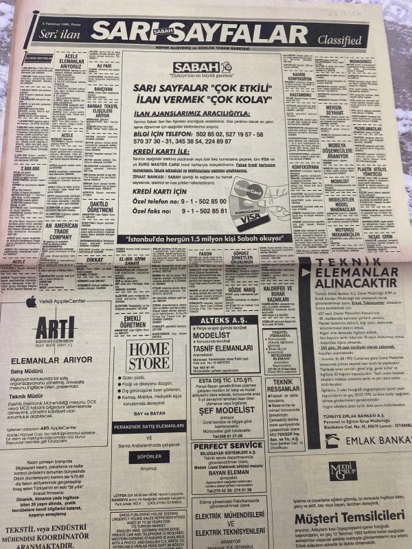 SABAH İSTANBUL ÖZEL SERİ SARI SAYFALAR DOĞUM GÜNÜ GAZETESİ - 5 TEMMUZ 1992 -emlak bankası-medi group-artı bilgisayar-Altex-Karamürsel-Emms otomotiv-Koç Holding-askom-sigorta-garson-mobilya-kuaför-Çocuk bakım-emlakçı-sağlık-tahsilatçı-şoför-temizlik elemanı-tezgahtar-tornacı-kasap-pastane-muhasebe-Beşiktaş-Beykoz-Alibeyköy-Bağcılar-Bakırköy-Gayrettepe-laleli-Levent-Gaziosmanpaşa-Fatih-Beşiktaş-Fındıkzade-Küçükçekmece-Ortaköy-Florya-Fulya- Üsküdar-Göztepe-Bağlarbaşı-Ataşehir-Yalova-Tuzla-Avcılar-Ulus-Merter-Anadoluhisarı-Tarabya-Sefaköy-yakacık-Suadiye-moda-kazasker-Maltepe-Kartal-Kalamış-Kadıköy-bostancı-akatlar Mecidiyeköy-Kocamustafapaşa-Çamlıca-Koşuyolu-Pendik-Kozyatağı-Ford-Mercedes-Citroen-BMW-Mazda-Kartal adlı eser, Kitap > Süreli Yayınlar > Gazeteler > Türkiye > Genel > Günlük kategorisinde İkinci El olarak satıştadır.