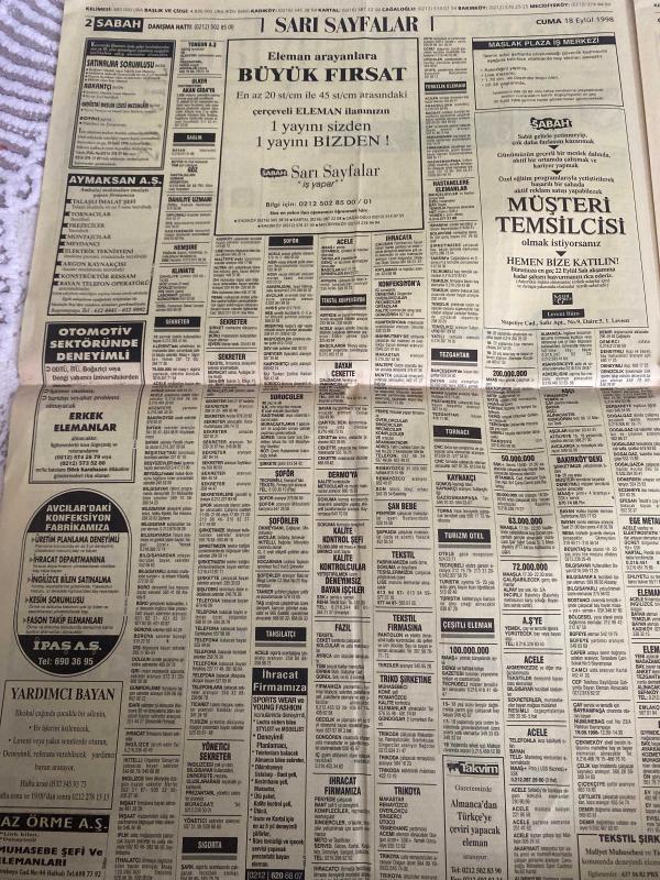 SABAH İSTANBUL ÖZEL SERİ SARI SAYFALAR GAZETESİ - 18 Eylül 1998 - sigorta-garson-mobilya-kuaför-Çocuk bakım-emlakçı-sağlık-tahsilatçı-şoför-temizlik elemanı-tezgahtar-tornacı-kasap-pastane-muhasebe-Beşiktaş-Beykoz-Alibeyköy-Bağcılar-Bakırköy-Gayrettepe-laleli-Levent-Gaziosmanpaşa-Fatih-Beşiktaş-Fındıkzade-Küçükçekmece-Ortaköy-Florya-Fulya- Üsküdar-Göztepe-Bağlarbaşı-Ataşehir-Yalova-Tuzla-Avcılar-Ulus-Merter-Anadoluhisarı-Tarabya-Sefaköy-yakacık-Suadiye-moda-kazasker-Maltepe-Kartal-Kalamış-Kadıköy-bostancı-akatlar Mecidiyeköy-Kocamustafapaşa-Çamlıca-Koşuyolu-Pendik-Kozyatağı-Ford-Mercedes-Citroen-BMW-Mazda-Kartal-Renault-Opel-Nissan-Mitsubishi-Kartal-Tempra-Doğan-Şahin-Murat-boyut otomotiv-newlıne business school-Dilko english-melka elektronik-Aymaksan aş-naz örme-Maslak plaza iş merkezi-kabash telekom-telecenter-İstanbul telekom-west telekom-panofis-zerrin otomotiv-Anadolu grubu, DİNÇ BİLGİN tarafından kaleme alınmıştır. SABAH İSTANBUL ÖZEL SERİ SARI SAYFALAR GAZETESİ - 18 Eylül 1998 - sigorta-garson-mobilya-kuaför-Çocuk bakım-emlakçı-sağlık-tahsilatçı-şoför-temizlik elemanı-tezgahtar-tornacı-kasap-pastane-muhasebe-Beşiktaş-Beykoz-Alibeyköy-Bağcılar-Bakırköy-Gayrettepe-laleli-Levent-Gaziosmanpaşa-Fatih-Beşiktaş-Fındıkzade-Küçükçekmece-Ortaköy-Florya-Fulya- Üsküdar-Göztepe-Bağlarbaşı-Ataşehir-Yalova-Tuzla-Avcılar-Ulus-Merter-Anadoluhisarı-Tarabya-Sefaköy-yakacık-Suadiye-moda-kazasker-Maltepe-Kartal-Kalamış-Kadıköy-bostancı-akatlar Mecidiyeköy-Kocamustafapaşa-Çamlıca-Koşuyolu-Pendik-Kozyatağı-Ford-Mercedes-Citroen-BMW-Mazda-Kartal-Renault-Opel-Nissan-Mitsubishi-Kartal-Tempra-Doğan-Şahin-Murat-boyut otomotiv-newlıne business school-Dilko english-melka elektronik-Aymaksan aş-naz örme-Maslak plaza iş merkezi-kabash telekom-telecenter-İstanbul telekom-west telekom-panofis-zerrin otomotiv-Anadolu grubu adlı eser Türkçe dilindedir.