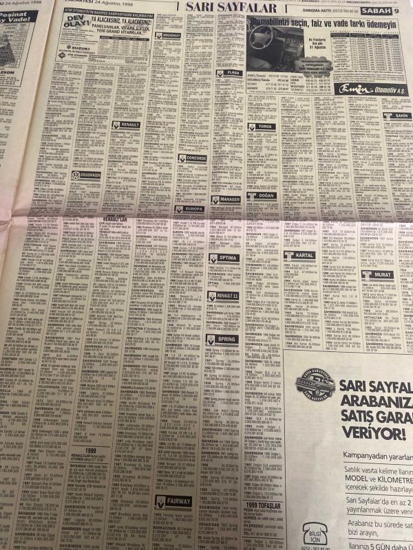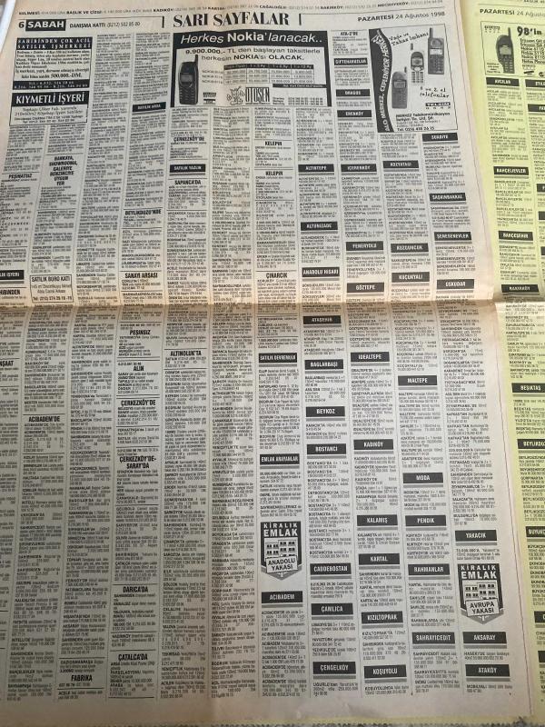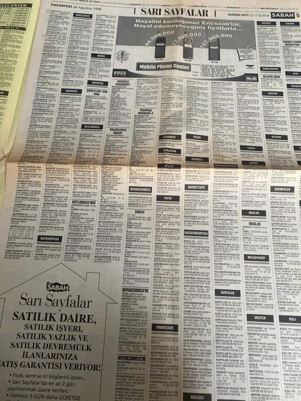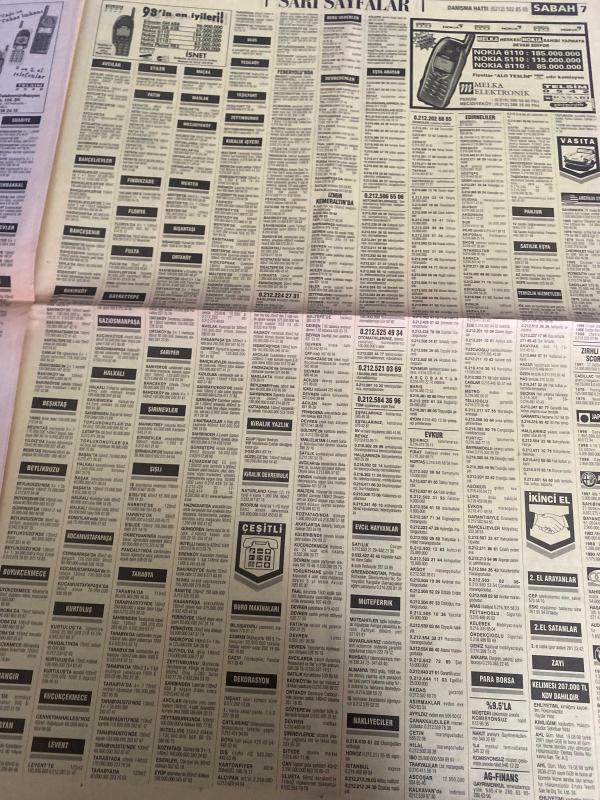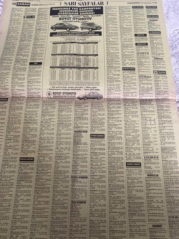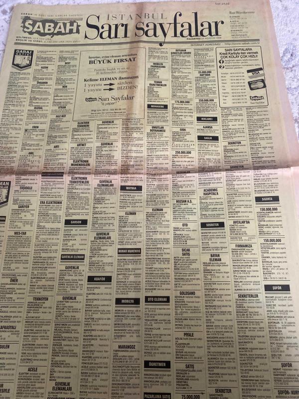 SABAH İSTANBUL ÖZEL SERİ SARI SAYFALAR GAZETESİ - 24 Ağustos 1998 - sigorta-garson-mobilya-kuaför-Çocuk bakım-emlakçı-sağlık-tahsilatçı-şoför-temizlik elemanı-tezgahtar-tornacı-kasap-pastane-muhasebe-Beşiktaş-Beykoz-Alibeyköy-Bağcılar-Bakırköy-Gayrettepe-laleli-Levent-Gaziosmanpaşa-Fatih-Beşiktaş-Fındıkzade-Küçükçekmece-Ortaköy-Florya-Fulya- Üsküdar-Göztepe-Bağlarbaşı-Ataşehir-Yalova-Tuzla-Avcılar-Ulus-Merter-Anadoluhisarı-Tarabya-Sefaköy-yakacık-Suadiye-moda-kazasker-Maltepe-Kartal-Kalamış-Kadıköy-bostancı-akatlar Mecidiyeköy-Kocamustafapaşa-Çamlıca-Koşuyolu-Pendik-Kozyatağı-Ford-Mercedes-Citroen-BMW-Mazda-Kartal-Renault-Opel-Nissan-Mitsubishi-Kartal-Tempra-Doğan-Şahin-Murat-Öreneller örme sanayi-medya ofset-sense tekstil-Gülçelik gıda-kaplan cam-Rocland Germany-Çevko Vakfı-Panofis-Planet 993-nesrin emlak-telecenter-Telsis-otoşen haberleşme-İsnet-Melka elektronik-İstanbul telekom-ATM otomotiv-Emin otomotiv-boyut otomotiv adlı eser, Kitap > Süreli Yayınlar > Gazeteler > Türkiye > Genel > Günlük kategorisinde İkinci El olarak satıştadır.