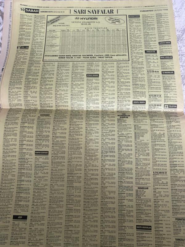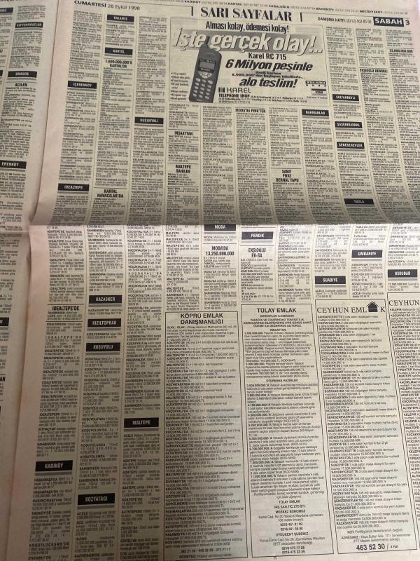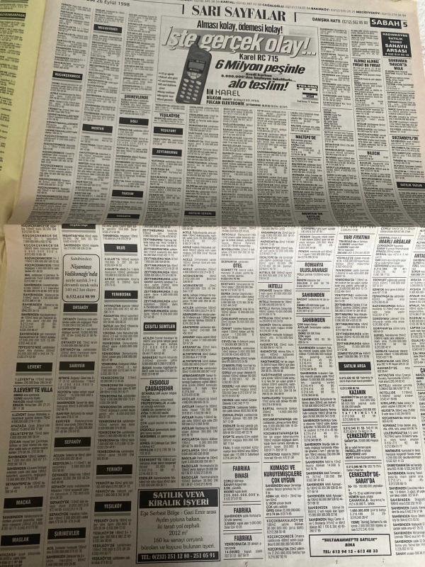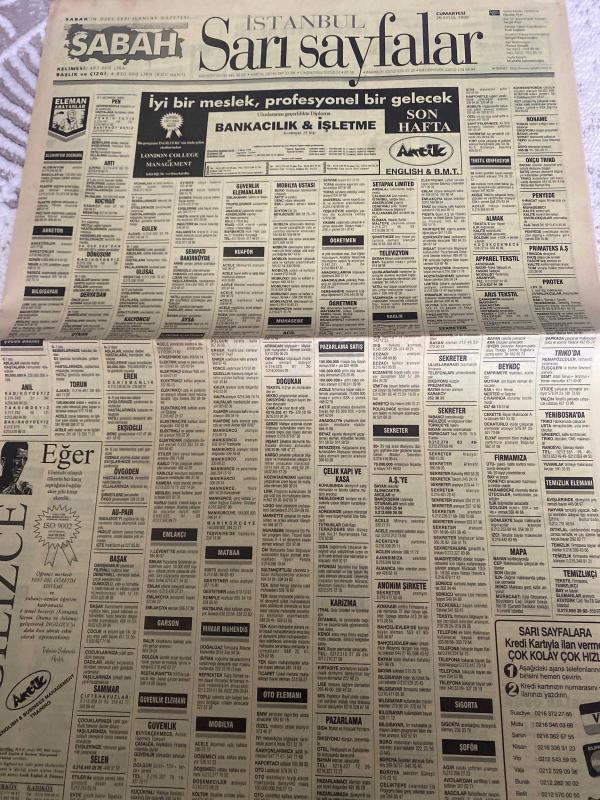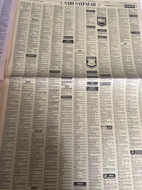 SABAH İSTANBUL ÖZEL SERİ SARI SAYFALAR GAZETESİ - 26 Eylül 1998 - sigorta-garson-mobilya-kuaför-Çocuk bakım-emlakçı-sağlık-tahsilatçı-şoför-temizlik elemanı-tezgahtar-tornacı-kasap-pastane-muhasebe-Beşiktaş-Beykoz-Alibeyköy-Bağcılar-Bakırköy-Gayrettepe-laleli-Levent-Gaziosmanpaşa-Fatih-Beşiktaş-Fındıkzade-Küçükçekmece-Ortaköy-Florya-Fulya- Üsküdar-Göztepe-Bağlarbaşı-Ataşehir-Yalova-Tuzla-Avcılar-Ulus-Merter-Anadoluhisarı-Tarabya-Sefaköy-yakacık-Suadiye-moda-kazasker-Maltepe-Kartal-Kalamış-Kadıköy-bostancı-akatlar Mecidiyeköy-Kocamustafapaşa-Çamlıca-Koşuyolu-Pendik-Kozyatağı-Ford-Mercedes-Citroen-BMW-Mazda-Kartal-Renault-Opel-Nissan-Mitsubishi-Kartal-Tempra-Doğan-Şahin-Murat-antik İngilizce-Tülay emlak-köprü emlak danışmanlığı-Ceyhun emlak-karel telefon Shop-duman Tekstil-Ercan giyim-ümit Örme-bescom-brode fabrikası-full can elektronik-Hilal telekom-levent otomotiv Maslak adlı eser, Kitap > Süreli Yayınlar > Gazeteler > Türkiye > Genel > Günlük kategorisinde İkinci El olarak satıştadır.