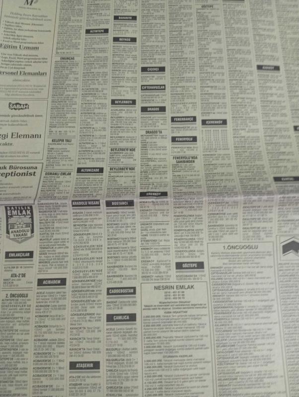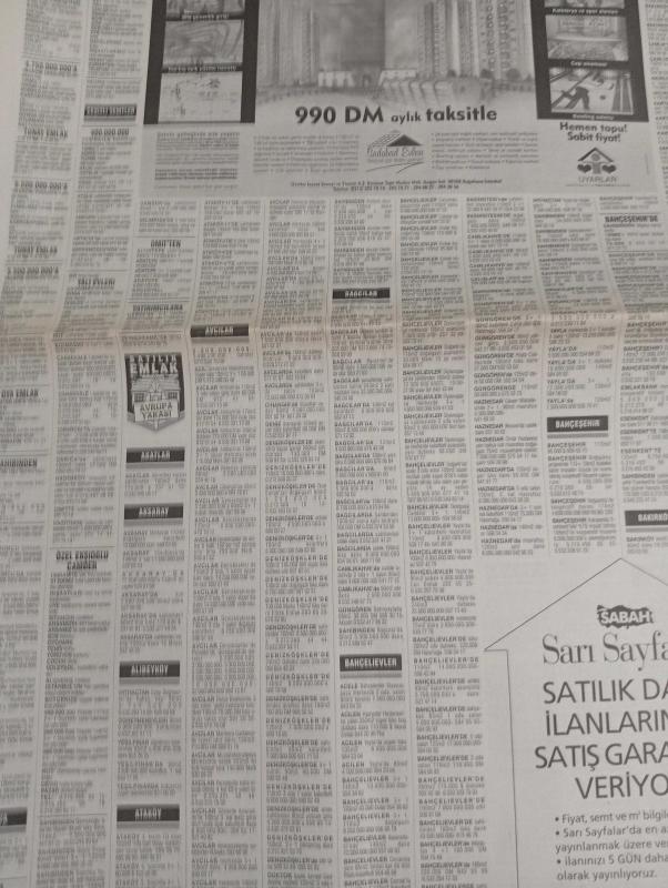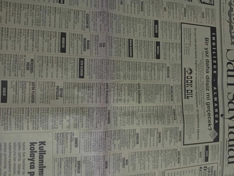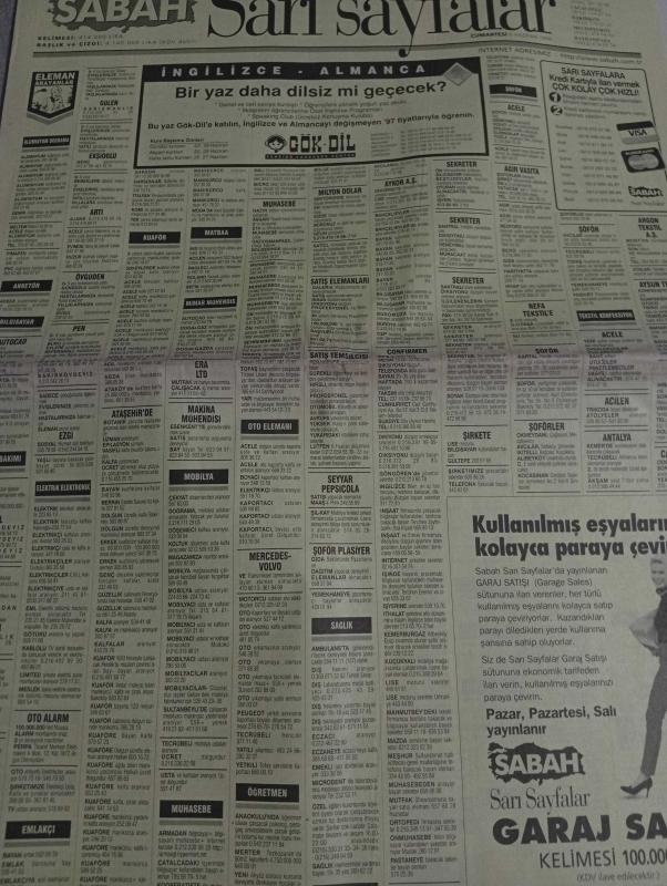 SABAH İSTANBUL ÖZEL SERİ SARI SAYFALAR GAZETESİ - 6 haziran 1998 - sigorta-garson-mobilya-kuaför-Çocuk bakım-emlakçı-sağlık-tahsilatçı-şoför-temizlik elemanı-tezgahtar-tornacı-kasap-pastane-muhasebe-Beşiktaş-Beykoz-Alibeyköy-Bağcılar-Bakırköy-Gayrettepe-laleli-Levent-Gaziosmanpaşa-Fatih-Beşiktaş-Fındıkzade-Küçükçekmece-Ortaköy-Florya-Fulya- Üsküdar-Göztepe-Bağlarbaşı-Ataşehir-Yalova-Tuzla-Avcılar-Ulus-Merter-Anadoluhisarı-Tarabya-Sefaköy-yakacık-Suadiye-moda-kazasker-Maltepe-Kartal-Kalamış-Kadıköy-bostancı-akatlar Mecidiyeköy-Kocamustafapaşa-Çamlıca-Koşuyolu-Pendik-Kozyatağı-Ford-Mercedes-Citroen-BMW-Mazda-Kartal-Renault-Opel-Nissan-Mitsubishi-Kartal-Tempra-Doğan-Şahin-Murat-gök dil foreıgn language centere-nesrin emlak-bosmar trans-erşahin tekstil-crea concept-ercan giyim sanayi-cansev emlak-aktüel-öztürk tekstil-reorganizasyon-liderkent-sadabad evleri-lider şirketler grubu adlı eser, Kitap > Süreli Yayınlar > Gazeteler > Türkiye > Genel > Günlük kategorisinde İkinci El olarak satıştadır.