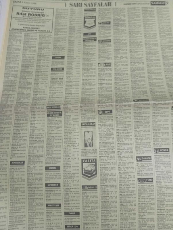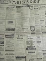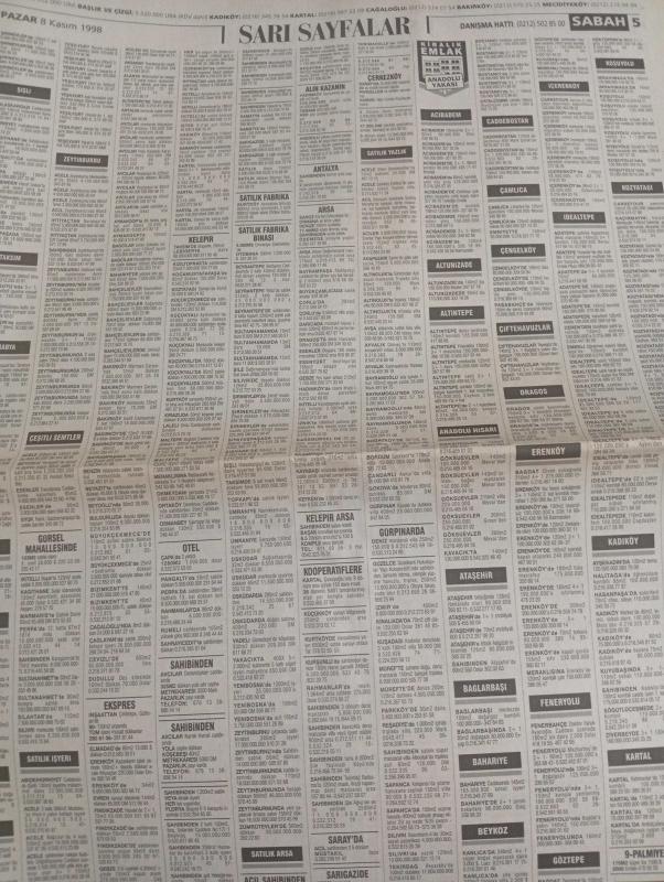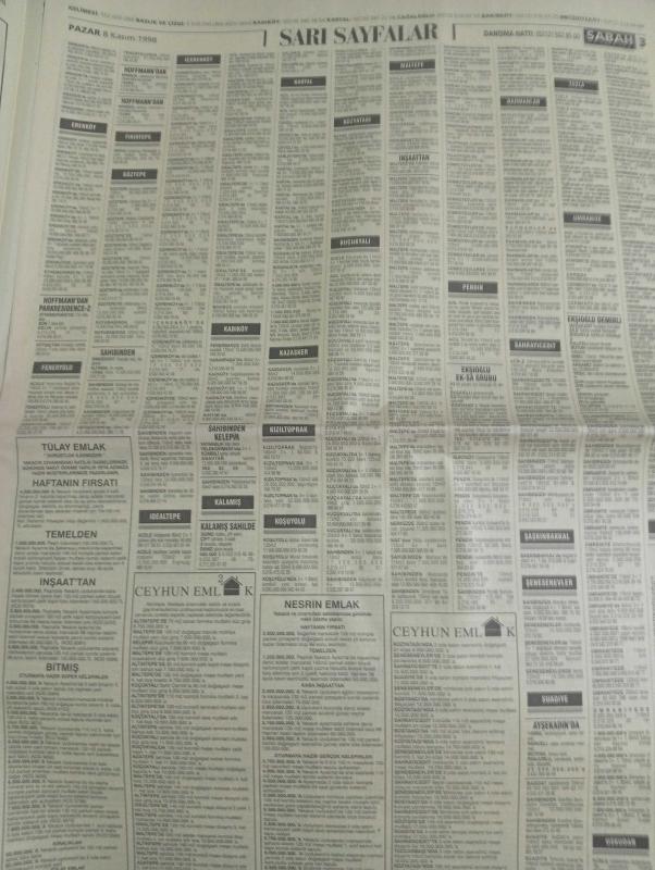SABAH İSTANBUL ÖZEL SERİ SARI SAYFALAR GAZETESİ - 8 kasım 1998 - sigorta-garson-mobilya-kuaför-Çocuk bakım-emlakçı-sağlık-tahsilatçı-şoför-temizlik elemanı-tezgahtar-tornacı-kasap-pastane-muhasebe-Beşiktaş-Beykoz-Alibeyköy-Bağcılar-Bakırköy-Gayrettepe-laleli-Levent-Gaziosmanpaşa-Fatih-Beşiktaş-Fındıkzade-Küçükçekmece-Ortaköy-Florya-Fulya- Üsküdar-Göztepe-Bağlarbaşı-Ataşehir-Yalova-Tuzla-Avcılar-Ulus-Merter-Anadoluhisarı-Tarabya-Sefaköy-yakacık-Suadiye-moda-kazasker-Maltepe-Kartal-Kalamış-Kadıköy-bostancı-akatlar Mecidiyeköy-Kocamustafapaşa-Çamlıca-Koşuyolu-Pendik-Kozyatağı-Ford-Mercedes-Citroen-BMW-Mazda-Kartal-Renault-Opel-Nissan-Mitsubishi-Kartal-Tempra-Doğan-Şahin-Murat-muko tekstil-pro mima-mali tekstil-ontrans denizcilik-medusa-punut tekstil-karaca-ceyhun emlak-nesrin emlak-praksis genç giyim-koton eksport konfeksiyon-levent otomotiv-bayraktar otomotiv-aydoğanlar otomotiv adlı eser, Kitap > Süreli Yayınlar > Gazeteler > Türkiye > Genel > Günlük kategorisinde İkinci El olarak satıştadır.