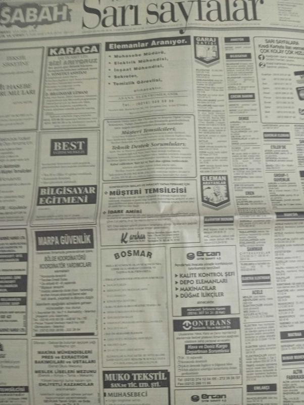 SABAH İSTANBUL ÖZEL SERİ SARI SAYFALAR GAZETESİ - 8 kasım 1998 - sigorta-garson-mobilya-kuaför-Çocuk bakım-emlakçı-sağlık-tahsilatçı-şoför-temizlik elemanı-tezgahtar-tornacı-kasap-pastane-muhasebe-Beşiktaş-Beykoz-Alibeyköy-Bağcılar-Bakırköy-Gayrettepe-laleli-Levent-Gaziosmanpaşa-Fatih-Beşiktaş-Fındıkzade-Küçükçekmece-Ortaköy-Florya-Fulya- Üsküdar-Göztepe-Bağlarbaşı-Ataşehir-Yalova-Tuzla-Avcılar-Ulus-Merter-Anadoluhisarı-Tarabya-Sefaköy-yakacık-Suadiye-moda-kazasker-Maltepe-Kartal-Kalamış-Kadıköy-bostancı-akatlar Mecidiyeköy-Kocamustafapaşa-Çamlıca-Koşuyolu-Pendik-Kozyatağı-Ford-Mercedes-Citroen-BMW-Mazda-Kartal-Renault-Opel-Nissan-Mitsubishi-Kartal-Tempra-Doğan-Şahin-Murat-muko tekstil-pro mima-mali tekstil-ontrans denizcilik-medusa-punut tekstil-karaca-ceyhun emlak-nesrin emlak-praksis genç giyim-koton eksport konfeksiyon-levent otomotiv-bayraktar otomotiv-aydoğanlar otomotiv, DİNÇ BİLGİN tarafından kaleme alınmıştır. SABAH İSTANBUL ÖZEL SERİ SARI SAYFALAR GAZETESİ - 8 kasım 1998 - sigorta-garson-mobilya-kuaför-Çocuk bakım-emlakçı-sağlık-tahsilatçı-şoför-temizlik elemanı-tezgahtar-tornacı-kasap-pastane-muhasebe-Beşiktaş-Beykoz-Alibeyköy-Bağcılar-Bakırköy-Gayrettepe-laleli-Levent-Gaziosmanpaşa-Fatih-Beşiktaş-Fındıkzade-Küçükçekmece-Ortaköy-Florya-Fulya- Üsküdar-Göztepe-Bağlarbaşı-Ataşehir-Yalova-Tuzla-Avcılar-Ulus-Merter-Anadoluhisarı-Tarabya-Sefaköy-yakacık-Suadiye-moda-kazasker-Maltepe-Kartal-Kalamış-Kadıköy-bostancı-akatlar Mecidiyeköy-Kocamustafapaşa-Çamlıca-Koşuyolu-Pendik-Kozyatağı-Ford-Mercedes-Citroen-BMW-Mazda-Kartal-Renault-Opel-Nissan-Mitsubishi-Kartal-Tempra-Doğan-Şahin-Murat-muko tekstil-pro mima-mali tekstil-ontrans denizcilik-medusa-punut tekstil-karaca-ceyhun emlak-nesrin emlak-praksis genç giyim-koton eksport konfeksiyon-levent otomotiv-bayraktar otomotiv-aydoğanlar otomotiv adlı eser Türkçe dilindedir.
