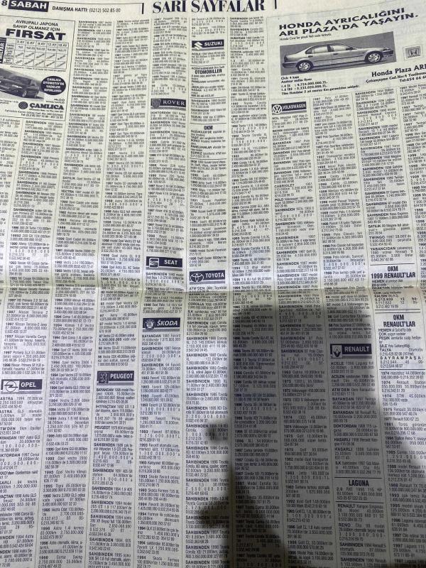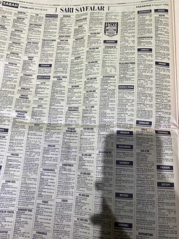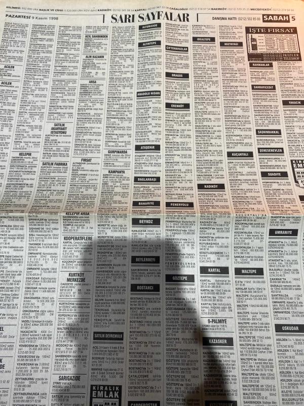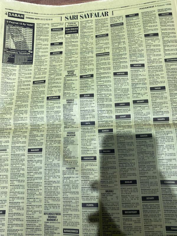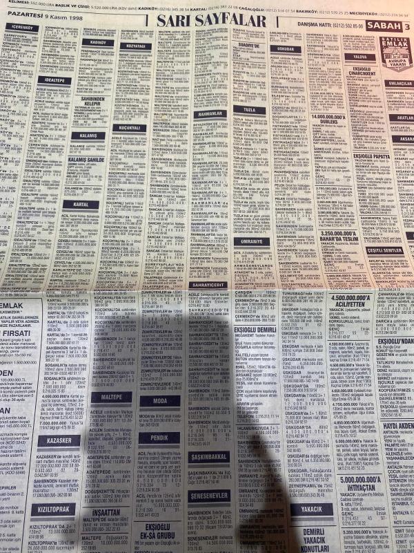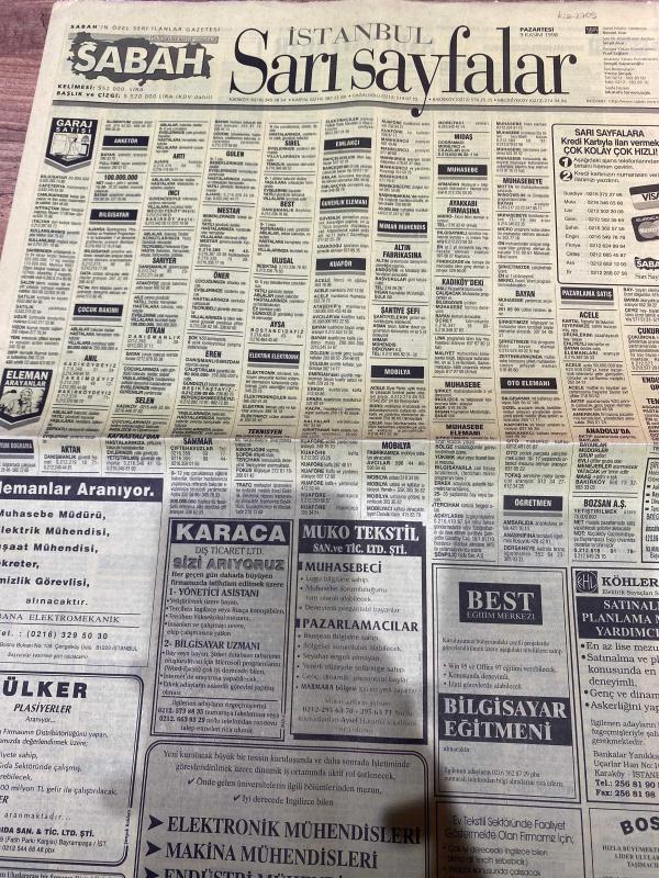 SABAH İSTANBUL ÖZEL SERİ SARI SAYFALAR GAZETESİ - 9 Kasım 1998 - sigorta-garson-mobilya-kuaför-Çocuk bakım-emlakçı-sağlık-tahsilatçı-şoför-temizlik elemanı-tezgahtar-tornacı-kasap-pastane-muhasebe-Beşiktaş-Beykoz-Alibeyköy-Bağcılar-Bakırköy-Gayrettepe-laleli-Levent-Gaziosmanpaşa-Fatih-Beşiktaş-Fındıkzade-Küçükçekmece-Ortaköy-Florya-Fulya- Üsküdar-Göztepe-Bağlarbaşı-Ataşehir-Yalova-Tuzla-Avcılar-Ulus-Merter-Anadoluhisarı-Tarabya-Sefaköy-yakacık-Suadiye-moda-kazasker-Maltepe-Kartal-Kalamış-Kadıköy-bostancı-akatlar Mecidiyeköy-Kocamustafapaşa-Çamlıca-Koşuyolu-Pendik-Kozyatağı-Ford-Mercedes-Citroen-BMW-Mazda-Kartal-Renault-Opel-Nissan-Mitsubishi-Kartal-Tempra-Doğan-Şahin-Murat-Abana- Karaca-muko Tekstil-best eğitim merkezi-Köhler elektrik sayaçları-Ülker Plasiyerler-okyanus gıda Sanayi-Semeteks tekstil-bosmar-tülay emlak Ekşioğlu Çınarcık kent-İstanbul telekom-ikizler Telshop-bayraktar otomotiv-Emin otomotiv-zirve otomotiv adlı eser, Kitap > Süreli Yayınlar > Gazeteler > Türkiye > Genel > Günlük kategorisinde İkinci El olarak satıştadır.