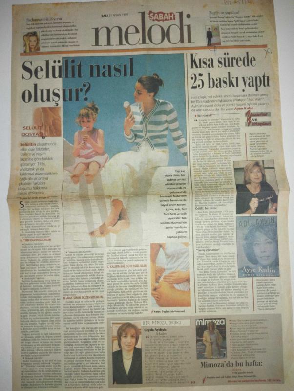 SABAH MELODİ GAZETESI DOĞUM GÜNÜ GAZETESI -21 Nisan 1998-Ayşe Kulin-Ceyda Aydede-Feride-Sibel-Ferdi Tayfur-Ahu Türkpençe-Meltem Cumbul-Tamer Karadağlı-Nazan Kesal-Carol Burnett-Gary Sinyor-Amanda Pays-Daniel Peacock-Türkan Şoray-Hümeyra-Yusuf Atala-Ayşen Gruda-Ayşe-Deniz Gökçe-Dilek Aslıhan-Osman Seden-Ayhan Işık-Müjde Ar-Karall Tibert-Ayşe Kulin Selülit nasıl oluşur-Kısa sürede 25 baskı yaptı-Migren hakkında bilinmeyenler-Tarumar çıldırdı-Temel Şirin’i seviyor-Tamurayı çıldırttı-Sibel zirveye koşuyor-Ferdi Tayfur ‘A’dan Z’ye-Feride-Aktüel’den Gündem-Öldüren Hatıralar-Yılanı Öldürseler-İffet-Segua-İntikam Alevi-İkili Oyun-Sahne Işıkları-Mimoza’da bu hafta-BİR MİMOZA OKURU Dino-Temel-Cathy-Tenten-Mutlu-Aileme Dönüyorum-Selülit Dosyası-Astroloji Kemal Aratan-İsmail Gülgeç-Akbulut-Murat Yılmaz-Bülent Arabacıoğlu adlı eser Türkçe dilindedir. Eserin içeriğinde Türkçe dilinde bölümlere de yer verilmektedir.