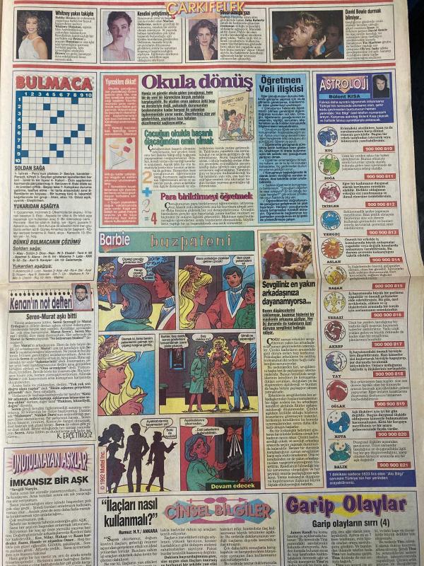 SABAH MELODİ GAZETESİ DOĞUM GÜNÜ HEDİYESİ (Türkish Newspapper) - 24 EYLÜL 1992 -Billur Kalkavan-Hakan Solaker-Nurdan Düzgören-Serap Kaynak-Nüket Akyüz-Funda Erdem-Fatoş Çamlı-Tuğba Öztaş-Nehir Sezgin-Ece Neytan-Sevnaz Uzan-Tülin Karaş-Hülya Çelik-Fatoş Antalya-Müge Topruköy-Zümrüt Duran-Polaris-Aysel Yalçınkaya-Melek Çakır-Özge Özsalman-Birgül Sinek-Nesrin Güneş-Loni Anderson-Farrah Fawcett-Bulent Kısa-David Bowie-Seren-Sema E.-Nuri-Ece-Kenan-Nihal Eken-Seda Sayan-Kenan İrgıtlız-Mevlüt Gül-Süleyman Turan Dövme çılgınlığı!-İşte çifte güvence işte teminat-“Tehdit ediliyorum”-Göğüs kanserinde gelişmeler-Sigarayı bırakınca şişmanlanmayın-Dünyadan kısa kısa-Farklı bir kek-Görgü kuralları-Gönül Abla-Rüyalarınız-Okula dönüş-Öğretmen veli ilişkisi-Astroloji-Kenan’ın not defteri-Unutulmayan aşklar-İmkânsız bir aşk-İlaçları nasıl kullanmalı?-Cinsel bilgiler-Garip olayların sırrı-Belediye Başkanı olabilirim-Seda Sayan Fatma Girik’in izinde-Arap Bacı’dan Ajax’ın arap sabunu reklamı-Body Reform adlı eser Türkçe dilindedir.