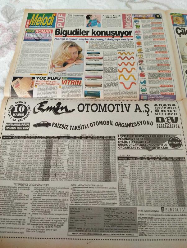 SABAH MELODİ GAZETESİ KADINLARA ÖZEL GAZETESİ - 20 Ekim 1993 -Karikatürler-Walt Disney/Boncuk-Mort Walker-Dick Browne/Bizim Aile-Tom Armstrong/Marvin-Graham Allen-John Dodd/Kral Kedi-Süleyman Turan/Dön Artık-Astroloji-Bülent Kısa-Klinik-Meltem Pusat-sağlığınız için soğan yiyin-kiralık elbise devri-çek bir süt-anne sütü mü inek sütü mü-kadın askere tazminat-sağlıklı manikür-yüzünüzü çalıştırın-neler oluyor hayatta-zevklerin en güzeli-bigudiler konuşuyor-angora kazak yıkarken-süt taşması-emin otomotiv-çile çekmek kemikleri güçlendiriyor-tereyağı-aşkınız yok olursa-saç dökülüyorsa-sarımsak sever misiniz-mantar ve pirzolalı pirinç pilavı-kedi kızın dönüşü-jale saçlarını erkek berberine kestiriyor-cüce yıldızlar-jurassic Park, DİNÇ BİLGİN tarafından kaleme alınmıştır. SABAH MELODİ GAZETESİ KADINLARA ÖZEL GAZETESİ - 20 Ekim 1993 -Karikatürler-Walt Disney/Boncuk-Mort Walker-Dick Browne/Bizim Aile-Tom Armstrong/Marvin-Graham Allen-John Dodd/Kral Kedi-Süleyman Turan/Dön Artık-Astroloji-Bülent Kısa-Klinik-Meltem Pusat-sağlığınız için soğan yiyin-kiralık elbise devri-çek bir süt-anne sütü mü inek sütü mü-kadın askere tazminat-sağlıklı manikür-yüzünüzü çalıştırın-neler oluyor hayatta-zevklerin en güzeli-bigudiler konuşuyor-angora kazak yıkarken-süt taşması-emin otomotiv-çile çekmek kemikleri güçlendiriyor-tereyağı-aşkınız yok olursa-saç dökülüyorsa-sarımsak sever misiniz-mantar ve pirzolalı pirinç pilavı-kedi kızın dönüşü-jale saçlarını erkek berberine kestiriyor-cüce yıldızlar-jurassic Park adlı eser Türkçe dilindedir. Eserin içeriğinde Türkçe dilinde bölümlere de yer verilmektedir.