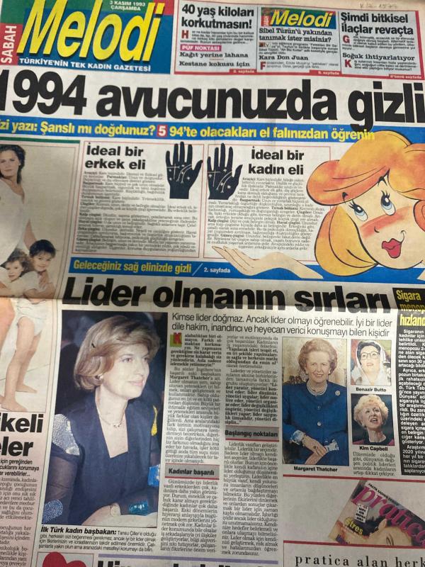 SABAH MELODİ GAZETESİ KADINLARA ÖZEL GAZETESİ - 3 Kasım 1993 -Karikatürler-Walt Disney/Boncuk-Mort Walker-Dick Browne/Bizim Aile-Tom Armstrong/Marvin-Graham Allen-John Dodd/Kral Kedi-Süleyman Turan/Dön Artık-Astroloji-Bülent Kısa-Klinik-Meltem Pusat-Pratica dergisi-hipnozla iyileşsin-Tansu Çiller-lider olmanın sırları-sigara menopozu hızlandırıyor-ideal bir erkek eli-ideal bir kadın eli-Benazir Butto-Kim Capbell-Margaret Thatcher-el falınız ve 94 falınız-Sedef eldem-Ahmet Günay-melodi Roman-felekten bir gece-Tayfun-Sibel Tüzün-Ali Öztürk-Aysel Gürel, DİNÇ BİLGİN tarafından kaleme alınmıştır. SABAH MELODİ GAZETESİ KADINLARA ÖZEL GAZETESİ - 3 Kasım 1993 -Karikatürler-Walt Disney/Boncuk-Mort Walker-Dick Browne/Bizim Aile-Tom Armstrong/Marvin-Graham Allen-John Dodd/Kral Kedi-Süleyman Turan/Dön Artık-Astroloji-Bülent Kısa-Klinik-Meltem Pusat-Pratica dergisi-hipnozla iyileşsin-Tansu Çiller-lider olmanın sırları-sigara menopozu hızlandırıyor-ideal bir erkek eli-ideal bir kadın eli-Benazir Butto-Kim Capbell-Margaret Thatcher-el falınız ve 94 falınız-Sedef eldem-Ahmet Günay-melodi Roman-felekten bir gece-Tayfun-Sibel Tüzün-Ali Öztürk-Aysel Gürel adlı eser Türkçe dilindedir. Eserin içeriğinde Türkçe dilinde bölümlere de yer verilmektedir.
