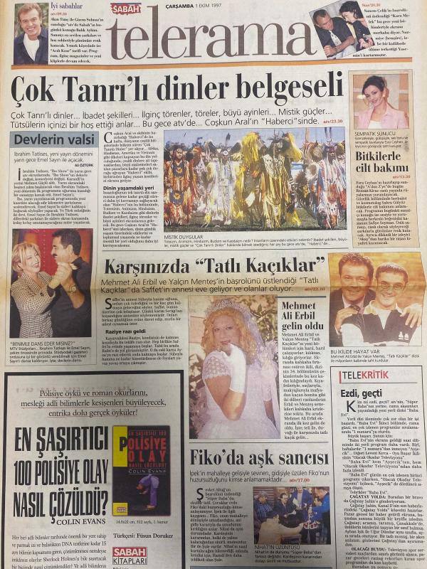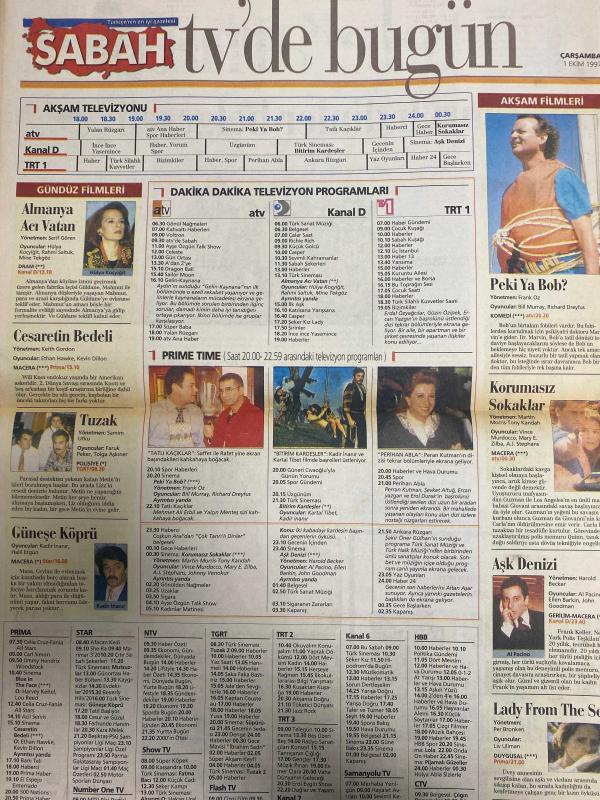 SABAH MELODİ GAZETESİ VE SABAH TELERAMA GAZETESİ -1 Ekim 1997 -Söyleyemedikleriniz--Süleyman Turan-Şöhret Tuzağı-Ah şu kocalar-Hale Pakcan-Mimi ile Muti-Patrıck Mc Donnel-Bizim Aile-Mort Walker-Dıck Browne-Marvın-Tom Amstrong-astroloji-Şerif Ercan-Telekritik-Erdoğan sevgin--sabah TV’de bugün-Bu gün ne yapalım-Tekinel Baby-seda kaya Güler-Esra Öz-sabah kitapları-Şevket Altuğ--süper baba-Mehmet Ali erbil gelin oldu--Yalçın menteş-tatlı Kaçıklar—benimle dans eder misiniz-İbo Show-Mehmet güçlü--Emel Sayın-Levent Kır-Oya başar-Çağatay Şahin-Esra Ceyhan-akın tunç-gizem Solmaz-Sanem Çelik-Almanya acı Vatan--Hülya Koçyiğit-Rahmi Saltuk-Mine tekgöz-Serif gören--tuzak--Samim Utku—Faruk Peker--Tolga Aşkıner-bitirim kardeşler-Kadir İnanır-Kartal Tibet-perihan abla-perran kutman- korumasız sokaklar-aşk denizi-Al pacino-pijamalı güzeller-güneşe köprü—Kadir İnanır-Halil Ergün, DİNÇ BİLGİN tarafından kaleme alınmıştır. SABAH MELODİ GAZETESİ VE SABAH TELERAMA GAZETESİ -1 Ekim 1997 -Söyleyemedikleriniz--Süleyman Turan-Şöhret Tuzağı-Ah şu kocalar-Hale Pakcan-Mimi ile Muti-Patrıck Mc Donnel-Bizim Aile-Mort Walker-Dıck Browne-Marvın-Tom Amstrong-astroloji-Şerif Ercan-Telekritik-Erdoğan sevgin--sabah TV’de bugün-Bu gün ne yapalım-Tekinel Baby-seda kaya Güler-Esra Öz-sabah kitapları-Şevket Altuğ--süper baba-Mehmet Ali erbil gelin oldu--Yalçın menteş-tatlı Kaçıklar—benimle dans eder misiniz-İbo Show-Mehmet güçlü--Emel Sayın-Levent Kır-Oya başar-Çağatay Şahin-Esra Ceyhan-akın tunç-gizem Solmaz-Sanem Çelik-Almanya acı Vatan--Hülya Koçyiğit-Rahmi Saltuk-Mine tekgöz-Serif gören--tuzak--Samim Utku—Faruk Peker--Tolga Aşkıner-bitirim kardeşler-Kadir İnanır-Kartal Tibet-perihan abla-perran kutman- korumasız sokaklar-aşk denizi-Al pacino-pijamalı güzeller-güneşe köprü—Kadir İnanır-Halil Ergün adlı eser Türkçe dilindedir.