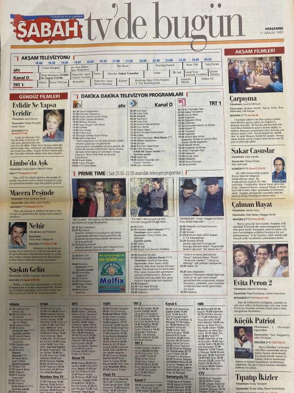 SABAH MELODİ GAZETESİ VE SABAH TELERAMA GAZETESİ -11 Aralık 1997 -Seda Kaya Güler-Söyleyemedikleriniz--Ah şu kocalar-Hale Pakcan-Mimi ile Muti-Patrıck Mc Donnel-Bizim Aile-Mort Walker-Dıck Browne-Marvın-Tom Amstrong-astroloji-Şerif Ercan-Telekritik-Erdoğan sevgin--sabah TV’de bugün-Elif ergü-bugün ne yapalım-17 tane cinni olduğunu söyleyen medyum Hayriye Yıldız-modacı Rıfat Özbek-Meltem pusat-Ahmet uğurlu-Ediz Hun-Berna Laçin-Yalçın dümer-süper baba Fiko-İbo Show-tayfun talip-Demirel-Şebnem dönmez-TRT 2’de İdil Biret konseri-Tansu Çiller-Nadide Sultan-Göksel ve Deniz Erdoğan-Hülya Koçyiğit-Limbo’da Aşk-Macera Peşinde-Nehir-Şerif Gönen-Şaşkın gelin-Nilüfer açıkkalın-Hüseyin Karagöz-Çalınan hayat-Sakar Casuslar-Çarpışma-Evita Peron 2-Küçük Patriot-Tıpatıp İkizler-Chevy Chase-Kadir İnanır, DİNÇ BİLGİN tarafından kaleme alınmıştır. SABAH MELODİ GAZETESİ VE SABAH TELERAMA GAZETESİ -11 Aralık 1997 -Seda Kaya Güler-Söyleyemedikleriniz--Ah şu kocalar-Hale Pakcan-Mimi ile Muti-Patrıck Mc Donnel-Bizim Aile-Mort Walker-Dıck Browne-Marvın-Tom Amstrong-astroloji-Şerif Ercan-Telekritik-Erdoğan sevgin--sabah TV’de bugün-Elif ergü-bugün ne yapalım-17 tane cinni olduğunu söyleyen medyum Hayriye Yıldız-modacı Rıfat Özbek-Meltem pusat-Ahmet uğurlu-Ediz Hun-Berna Laçin-Yalçın dümer-süper baba Fiko-İbo Show-tayfun talip-Demirel-Şebnem dönmez-TRT 2’de İdil Biret konseri-Tansu Çiller-Nadide Sultan-Göksel ve Deniz Erdoğan-Hülya Koçyiğit-Limbo’da Aşk-Macera Peşinde-Nehir-Şerif Gönen-Şaşkın gelin-Nilüfer açıkkalın-Hüseyin Karagöz-Çalınan hayat-Sakar Casuslar-Çarpışma-Evita Peron 2-Küçük Patriot-Tıpatıp İkizler-Chevy Chase-Kadir İnanır adlı eser Türkçe dilindedir.