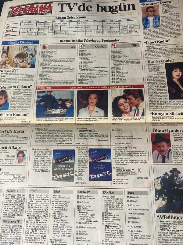 SABAH MELODİ GAZETESİ VE SABAH TELERAMA GAZETESİ - 15 Kasım 1996 -Karikatürler-Walt Disney/Boncuk-Mort Walker-Dick Browne/Bizim Aile-Tom Armstrong/Marvin-Graham Allen-John Dodd/Kral Kedi-Süleyman Turan/Dön Artık-Astroloji-Bülent Kısa-Klinik-Meltem Pusat-Telerama Programı-Sabah Filmleri-Öğlen Filmleri-Akşam Filmleri-Erdoğan Sevgin-konfor mobilya-Şerif Ercan-Mardinli milletvekili Kamil boran-Elif ergu-Ali kırca-boran Kaya-Ekrem Çatay-Emre dağdeviren-Alper Cücenoğlu-minteks-Gonca karakaş-Arzu taşdemir-Paulo Coelho-Sakıp Sabancı-taksi-Bernar Laçin-Ayşen Gruda-Önder açıkalın—perihan Savaş-muazzez Ersoy-Savaş Dinçer-zihni göktay-Cihat Tamer-Bilge Şen-oğlumun hayatı film-mükremin Çıtır-Yılmaz Erdoğan-süper baba-Şevket Altuğ-Hasan Hüseyin Ceylan-Sadettin peksoy--küçük ev-Necla naz--Sezer İnanoğlu—düş gezginleri-Meral Oğuz-Lale Mansur-Yaman Okay-ölüm oyunları-dördüncü hikaye-Mark Harmon-Maruschka Detmers adlı eser, Kitap > Süreli Yayınlar > Gazeteler > Türkiye > Genel > Günlük kategorisinde İkinci El olarak satıştadır.
