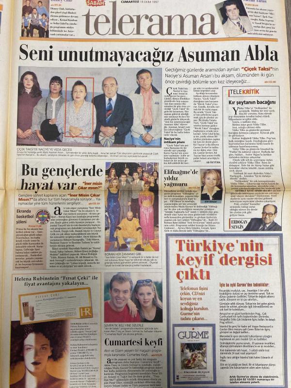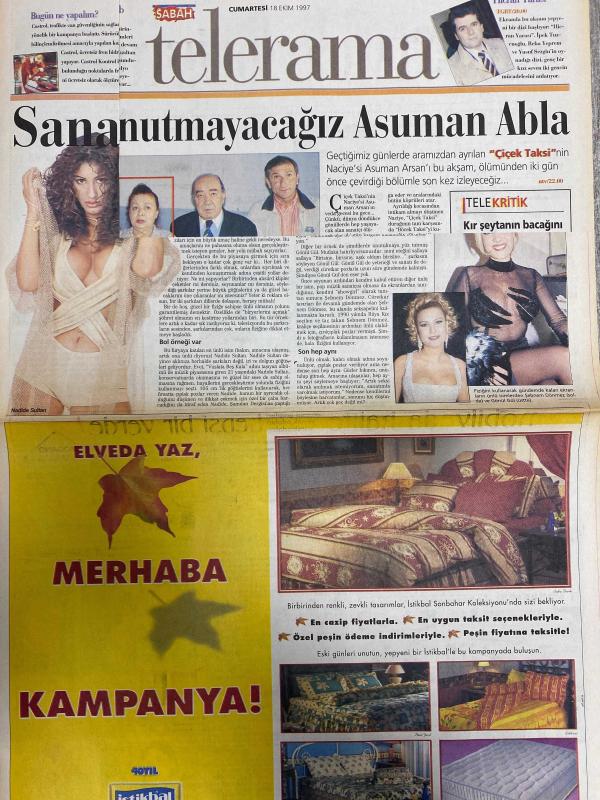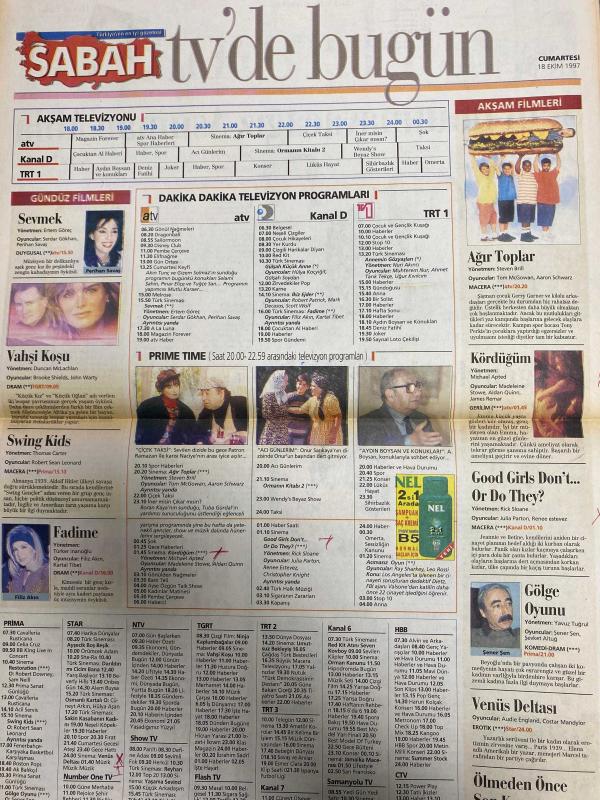 SABAH MELODİ GAZETESİ VE SABAH TELERAMA GAZETESİ -18 Ekim 1997 -Söyleyemedikleriniz--Süleyman Turan-Şöhret Tuzağı-Ah şu kocalar-Hale Pakcan-Mimi ile Muti-Patrıck Mc Donnel-Bizim Aile-Mort Walker-Dıck Browne-Marvın-Tom Amstrong-astroloji-Şerif Ercan-Telekritik-Erdoğan sevgin--sabah TV’de bugün-Bu gün ne yapalım-nadide Sultan-Castrol-gül-Şebnem dönmez-istikbal-Hakan Şükür-Meltem pusat-Polteks tekstil-karaca ayakkabı-iner misin çıkar mısın-boran Kaya-Çiçek taksi-Disney Club-Selin Gülel-Kemal kızıltan-Ali Öztürk-Elif Dinçer-İpek Tuzcuoğlu-Reha Yeprem-Yusuf Sezgin-Gurme dergisi-Akın tunç-gizem Solmaz-perihan Savaş-Serdar Gökhan--Sevmek--vahşi koşu--Fadime--Türker İnanoğlu-Filiz Akın-Kartal Tibet-acı günlerim-onur Sarıkaya-Aydın Boysan ve konukları-ağır toplar--kördüğüm-gölge oyunu-Şener Şen--Şevket Altuğ-Yavuz Tuğrul-ölmeden önce son kez, DİNÇ BİLGİN tarafından kaleme alınmıştır. SABAH MELODİ GAZETESİ VE SABAH TELERAMA GAZETESİ -18 Ekim 1997 -Söyleyemedikleriniz--Süleyman Turan-Şöhret Tuzağı-Ah şu kocalar-Hale Pakcan-Mimi ile Muti-Patrıck Mc Donnel-Bizim Aile-Mort Walker-Dıck Browne-Marvın-Tom Amstrong-astroloji-Şerif Ercan-Telekritik-Erdoğan sevgin--sabah TV’de bugün-Bu gün ne yapalım-nadide Sultan-Castrol-gül-Şebnem dönmez-istikbal-Hakan Şükür-Meltem pusat-Polteks tekstil-karaca ayakkabı-iner misin çıkar mısın-boran Kaya-Çiçek taksi-Disney Club-Selin Gülel-Kemal kızıltan-Ali Öztürk-Elif Dinçer-İpek Tuzcuoğlu-Reha Yeprem-Yusuf Sezgin-Gurme dergisi-Akın tunç-gizem Solmaz-perihan Savaş-Serdar Gökhan--Sevmek--vahşi koşu--Fadime--Türker İnanoğlu-Filiz Akın-Kartal Tibet-acı günlerim-onur Sarıkaya-Aydın Boysan ve konukları-ağır toplar--kördüğüm-gölge oyunu-Şener Şen--Şevket Altuğ-Yavuz Tuğrul-ölmeden önce son kez adlı eser Türkçe dilindedir.