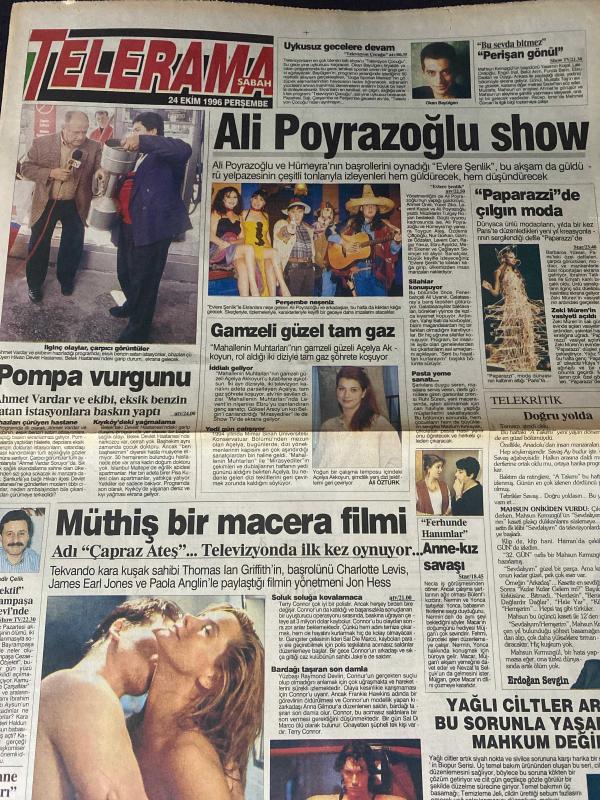 SABAH MELODİ GAZETESİ VE SABAH TELERAMA GAZETESİ - 24 Ekim 1996 -Karikatürler-Walt Disney/Boncuk-Mort Walker-Dick Browne/Bizim Aile-Tom Armstrong/Marvin-Graham Allen-John Dodd/Kral Kedi-Süleyman Turan/Dön Artık-Astroloji-Bülent Kısa-Klinik-Meltem Pusat-Telerama Programı-Sabah Filmleri-Öğlen Filmleri-Akşam Filmleri-Erdoğan Sevgin-Sabah yatakları-fakir firması-Çiğdem Kiziroğlu-Kadir Çelik-Uğur Dündar-Thomas Lan Griffith-Okan Bayülgen-Açelya Akkoyun-Çapraz Ateş-Earl Jones-Yasemince-Yasemin Yalçın-Mahmut Kırmızıgül-Bu Sevda Bitmez-Yasemin Koşal-Lale Oraloğlu-adada son gece-Serdar güreş-Meltem Doğanay-Yaman tarcan-Kadir İnanır-Hülya Avşar-Tanju gürsu-Ölüm yolu-uyanık kardeşler-Müjdat gezen-Arzu okka—Kansu gibi akacak-Yılmaz Erdoğan-Arabistan Lawrence, DİNÇ BİLGİN tarafından kaleme alınmıştır. SABAH MELODİ GAZETESİ VE SABAH TELERAMA GAZETESİ - 24 Ekim 1996 -Karikatürler-Walt Disney/Boncuk-Mort Walker-Dick Browne/Bizim Aile-Tom Armstrong/Marvin-Graham Allen-John Dodd/Kral Kedi-Süleyman Turan/Dön Artık-Astroloji-Bülent Kısa-Klinik-Meltem Pusat-Telerama Programı-Sabah Filmleri-Öğlen Filmleri-Akşam Filmleri-Erdoğan Sevgin-Sabah yatakları-fakir firması-Çiğdem Kiziroğlu-Kadir Çelik-Uğur Dündar-Thomas Lan Griffith-Okan Bayülgen-Açelya Akkoyun-Çapraz Ateş-Earl Jones-Yasemince-Yasemin Yalçın-Mahmut Kırmızıgül-Bu Sevda Bitmez-Yasemin Koşal-Lale Oraloğlu-adada son gece-Serdar güreş-Meltem Doğanay-Yaman tarcan-Kadir İnanır-Hülya Avşar-Tanju gürsu-Ölüm yolu-uyanık kardeşler-Müjdat gezen-Arzu okka—Kansu gibi akacak-Yılmaz Erdoğan-Arabistan Lawrence adlı eser Türkçe dilindedir.