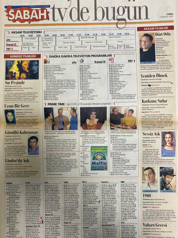 SABAH MELODİ GAZETESİ VE SABAH TELERAMA GAZETESİ -5 Aralık 1997 -Seda Kaya Güler-Söyleyemedikleriniz--Ah şu kocalar-Hale Pakcan-Mimi ile Muti-Patrıck Mc Donnel-Bizim Aile-Mort Walker-Dıck Browne-Marvın-Tom Amstrong-astroloji-Şerif Ercan-Telekritik-Erdoğan sevgin--sabah TV’de bugün-Elif ergü-Şükran Soner-Prof.Dr.Gaye Erbatur-Prof.Dr. Yeşim arat-Gülay Fırat-Diet Life-Mimoza-Sinan Kesgin-Şirin Seyer-Deja vu sendromu ve anılarıma yolculuk-Füsun Önal-Ali Kırca-Seda Sayan-Selda Alkor-Ali Öztürk-Kader ağlarını ördü-Esra Ceyhan-Okan bayülgen-Hülya Avşar-Şevket Altuğ-Süper Baba-Siyaset Meydanı-dört oda-yeniden ölmek—korkunç Sırlar-Sessiz Aşk-gönüllü kahraman-İlyas Salman-Ayşen Gruda-uzun bir gece-Aytaç Arman-Rober De Niro-Marlee Matlin-Burt Lancester-1900-Vahşet gecesi, DİNÇ BİLGİN tarafından kaleme alınmıştır. SABAH MELODİ GAZETESİ VE SABAH TELERAMA GAZETESİ -5 Aralık 1997 -Seda Kaya Güler-Söyleyemedikleriniz--Ah şu kocalar-Hale Pakcan-Mimi ile Muti-Patrıck Mc Donnel-Bizim Aile-Mort Walker-Dıck Browne-Marvın-Tom Amstrong-astroloji-Şerif Ercan-Telekritik-Erdoğan sevgin--sabah TV’de bugün-Elif ergü-Şükran Soner-Prof.Dr.Gaye Erbatur-Prof.Dr. Yeşim arat-Gülay Fırat-Diet Life-Mimoza-Sinan Kesgin-Şirin Seyer-Deja vu sendromu ve anılarıma yolculuk-Füsun Önal-Ali Kırca-Seda Sayan-Selda Alkor-Ali Öztürk-Kader ağlarını ördü-Esra Ceyhan-Okan bayülgen-Hülya Avşar-Şevket Altuğ-Süper Baba-Siyaset Meydanı-dört oda-yeniden ölmek—korkunç Sırlar-Sessiz Aşk-gönüllü kahraman-İlyas Salman-Ayşen Gruda-uzun bir gece-Aytaç Arman-Rober De Niro-Marlee Matlin-Burt Lancester-1900-Vahşet gecesi adlı eser Türkçe dilindedir.