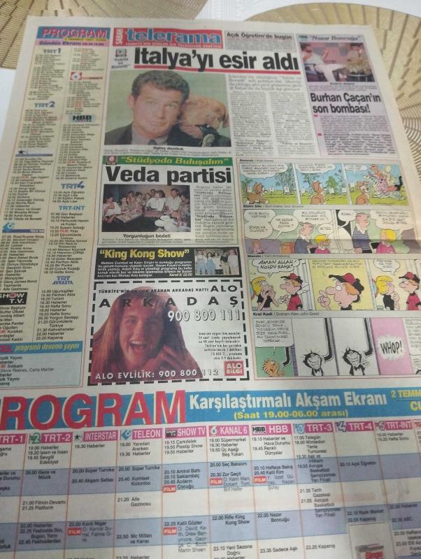 SABAH MELODİ GAZETESİ VE SABAH TELERAMA GAZETESİ KADINLARA ÖZEL - 2 Temmuz 1993 -Karikatürler-Walt Disney/Boncuk-Mort Walker-Dick Browne/Bizim Aile-Tom Armstrong/Marvin-Graham Allen-John Dodd/Kral Kedi-Süleyman Turan/Dön Artık-Astroloji-Bülent Kısa-Klinik-Meltem Pusat-Telerama Programı-Sabah Filmleri-Öğlen Filmleri-Akşam Filmleri-Erdoğan Sevgin-Coşkun sabah-avusturya-finlandiya-belçika-yeni zelanda-yasemin bozkurt-japon hanımlar-yeşilçam-kartal tibet-hayri caner-filiz akın-cüneyt arkın-burhan çaçan-güler kazmacı-kerim Aydın erdem-emin divrik-alttan aşar-cansu akbel-şişli belediye başkanı Fatma girik-ercan diler-kanlı nigar-kemal sunal-acıların çocuğu emrah-tatil gözler-dünkü çocuk-aşk yolculuğu-ömer şerif-bisiklet-zor geçit-stüdyoda buluşalım-açık öğretim-çocuk kuşağı-perihan abla-hanımın çiftliği-bir nefes sıhhat-aile gazinosu-dünya döndükçe-gecenin sınırı-pembe panter-yorgun savaşçı-görüntülerle türkiye-kahvehaneler-çarkıfelek adlı eser, Kitap > Süreli Yayınlar > Gazeteler > Türkiye > Genel > Günlük kategorisinde İkinci El olarak satıştadır.