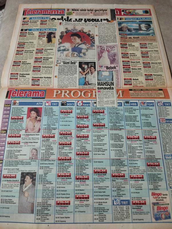 SABAH MELODİ GAZETESİ VE SABAH TELERAMA GAZETESİ KADINLARA ÖZEL - 24 Mart 1994 -Karikatürler-Walt Disney/Boncuk-Mort Walker-Dick Browne/Bizim Aile-Tom Armstrong/Marvin-Graham Allen-John Dodd/Kral Kedi-Süleyman Turan/Dön Artık-Astroloji-Bülent Kısa-Klinik-Meltem Pusat-Telerama Programı-Sabah Filmleri-Öğlen Filmleri-AkşamFilmleri- Levent kırca-oya başar-atv- selim gül-gaye akçıl-ömer Pınar- Bülent şar- Aykut oray-engin otomotiv-yıldız kenter-müşfik kenter-şükran Güngör- ufuk Yıldırım- eliminatör- Ahmet Hicri Ergin- asım can- Müge arda-mahsun Kırmızıgül- Beko- Umur Bugay- Emir Divrik- fatma Girik- Profesör Doktor Aydın Ataç-kenwood- Serpil çakmaklı-hakan Ural- bulut aras-nazan Saatçi- levent Kırca- orhan Sultan- Tom selleck-james farentino adlı eser, Kitap > Süreli Yayınlar > Gazeteler > Türkiye > Genel > Günlük kategorisinde İkinci El olarak satıştadır.