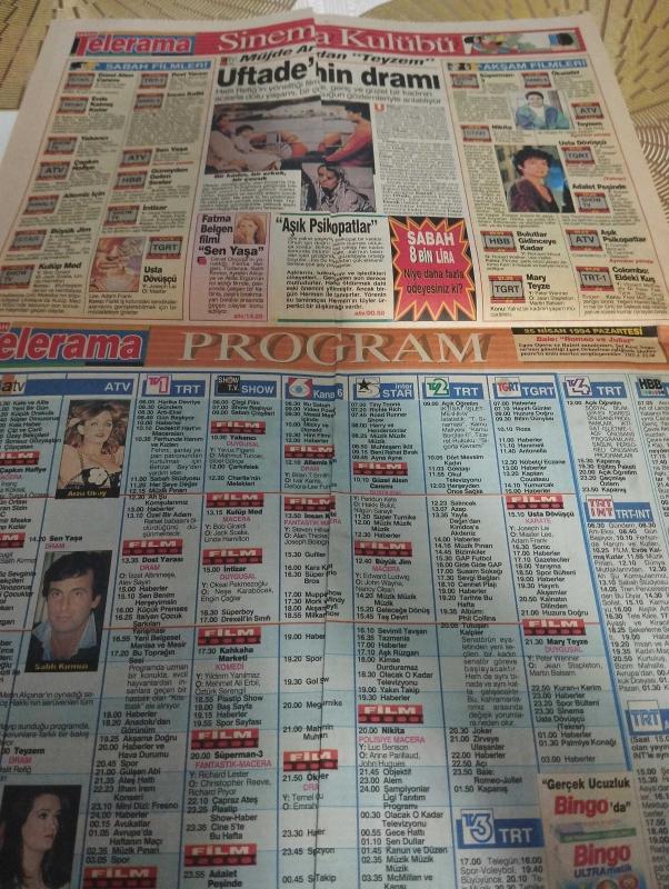SABAH MELODİ GAZETESİ VE SABAH TELERAMA GAZETESİ KADINLARA ÖZEL - 25 Nisan 1994 -Karikatürler-Walt Disney/Boncuk-Mort Walker-Dick Browne/Bizim Aile-Tom Armstrong/Marvin-Graham Allen-John Dodd/Kral Kedi-Süleyman Turan/Dön Artık-Astroloji-Bülent Kısa-Klinik-Meltem Pusat-Telerama Programı-Sabah Filmleri-Öğlen Filmleri-Akşam Filmleri-Erdoğan Sevgin-a takımında olay-savaş ay-taneli-samra sökmen-çelik erişçi-islamcıların özel yaşamı-halit kıvanç-hollanda güzeli linda-sertap parman-bir Sevgi anonsu-zeki alasya-metin akpınar-mahallenin muhtarları-ali uslu-Sururi bey-müge arda-deniz arcak-ebru gündeş-ateş attı-ali talip özdemir-zirveye ulaşanlar-ümit utku-sami erdem-tütün bank-yüksel uzel-bakırköy belediye başkanı-ayfer atay-refah partisi-bağcılar belediye'si-feyzullah kıyıklı-gögüs güzelliği -Arzu okay-salih kırmızı-müjde ar-muhteşem ikili-göktaşı-dört mevsim kadın-okul televizyonu-her şeyden önce sağlık-hakkı bulut-nilgün saraylı-geleceğe dönüş-taş devri-aşk rüzgarı-olacak o kadar televizyonu adlı eser, Kitap > Süreli Yayınlar > Gazeteler > Türkiye > Genel > Günlük kategorisinde İkinci El olarak satıştadır.