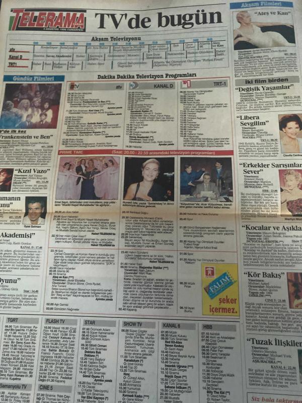 SABAH MELODİ GAZETESİ VE SABAH TELERAMA GAZETESİ KADINLARA ÖZEL - 3 Ağustos 1996 -Karikatürler-Walt Disney/Boncuk-Mort Walker-Dick Browne/Bizim Aile-Tom Armstrong/Marvin-Graham Allen-John Dodd/Kral Kedi-Süleyman Turan/Dön Artık-Astroloji-Bülent Kısa-Klinik-Meltem Pusat-Telerama Programı-Sabah Filmleri-Öğlen Filmleri- Akşam Filmleri-Erdoğan Sevgin-Şerif Ercan-Nihal Mete-Sofra Dergisi-Abdullah Akarsu-Seda Kaya Güler-Elif Ergu-Ebru Gündeş-Alfar Kozmetik-Tansu Çiller-Özer Çiller-Cansel Özzengin-Korcan Karar-Türk hukukçu kadınlar derneği başkanı avukat Aydeniz Alisbah Tuskan-Mutlu Günler-Şener Şen-Abbas Güçlü-İner misin çıkar mısın-Boran Kaya-Muazzez Abacı-Atilla Özgür-Emel Sayın-Cem Ceminay-Amanin boo-Ariston Buzdolabı-Michael York-Starduş-İlyas Salman-Hülya Koçyiğit-Murat Soydan-Ayşen Gruda-Marilyn Monroe-Claudia Cardinale-Natalie Bombay-Madeleine Stowe adlı eser, Kitap > Süreli Yayınlar > Gazeteler > Türkiye > Genel > Günlük kategorisinde İkinci El olarak satıştadır.