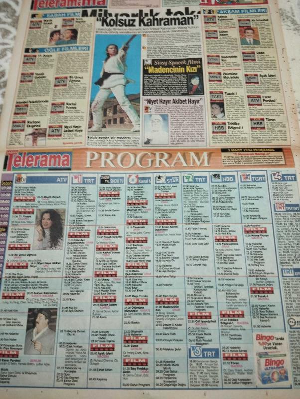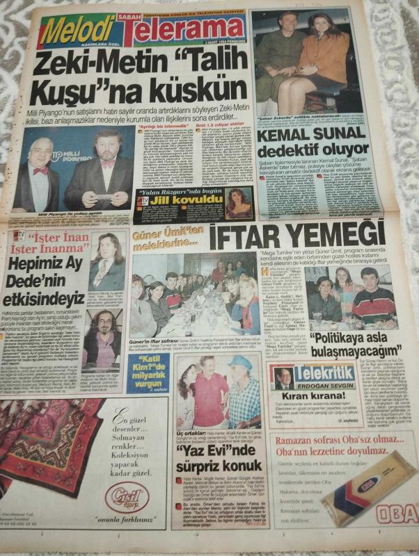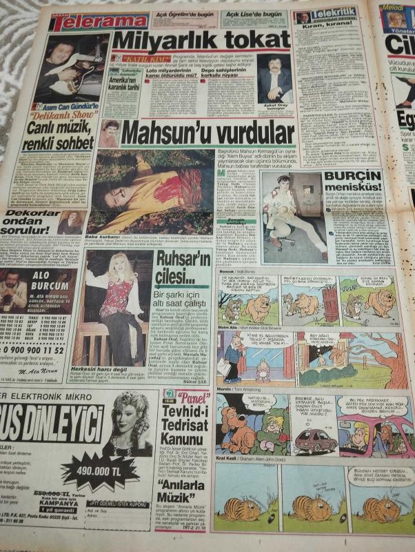 SABAH MELODİ GAZETESİ VE SABAH TELERAMA GAZETESİ KADINLARA ÖZEL - 3 Mart 1994 -Karikatürler-Walt Disney/Boncuk-Mort Walker-Dick Browne/Bizim Aile-Tom Armstrong/Marvin-Graham Allen-John Dodd/Kral Kedi-Süleyman Turan/Dön Artık-Astroloji-Bülent Kısa-Klinik-Meltem Pusat-Telerama Programı-Sabah Filmleri-Öğlen Filmleri-Akşam Filmleri-ErdoğanSevgin- Zeki Metin- zeki alasya-metin akpınar-kemal Sunal- Bülent şar-jill- Medyum Memiş- cisil eşarp-zafer Ergin- Güner Ümit- Yıldız kenter-müşfik kenter-şükran Güngör-oba- Güner Ümit- Asım Can Gündüz- aykut Oray- Alo burcum-casus dinleyici- panel- bülent şar-ruhsar Öcal- Mahsun kırmızıgül-efkan efekan- Emin Divrik- Alo bilgi- Engin Temizer-chang cheh- Hakkı bulut-fulya Koyuncu-dean Jones- Bulut aras-nilgün Saraylı- bingo- faruk Peker- adlı eser, Kitap > Süreli Yayınlar > Gazeteler > Türkiye > Genel > Günlük kategorisinde İkinci El olarak satıştadır.