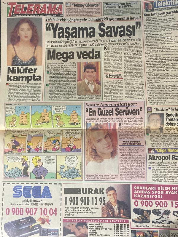 SABAH MELODİ GAZETESİ VE SABAH TELERAMA GAZETESİ KADINLARA ÖZEL - 30 Haziran 1994 -Karikatürler-Walt Disney/Boncuk-Mort Walker-Dick Browne/Bizim Aile-Tom Armstrong/Marvin-Graham Allen-John Dodd/Kral Kedi-Süleyman Turan/Dön Artık-Astroloji-Bülent Kısa-Klinik-Meltem Pusat-Telerama Programı-Sabah Filmleri-Öğlen Filmleri-Akşam Filmleri-Erdoğan Sevgin-Hakan Ural—Sibel Can-engin Can--Müşvik Kenter-şükran Güngör--kibariye-Songül Çoban fehim Yener-Osman Balcıgil-Jale-mehbare Çelik-Engin Özgen-Ali Öztürk-Tarkan-nükhet duru-Sezen Aksu-Yonca Evcimik-Pembe Mutlu-Adile Naşit-Ayşen Gruda-Kartal Tibet-Kemal Sunal-Şener Şen- Nilüfer-Güner Ümit-nesrin balkız—Soner Arıca-ANAP Fatih ilçesi belediye başkan adayı Sadettin Tantan-Burak-Gönül Abla-Sega-Saadettin Teksoy-Güneri Civaoğlu-Kibariye-Nurhan Damcıoğlu-Cüneyt Arkın-Sevda Ferdağ-Tarık Akan-Cavidan Akyol-Kırca-Ayşegül Atik adlı eser, Kitap > Süreli Yayınlar > Gazeteler > Türkiye > Genel > Günlük kategorisinde İkinci El olarak satıştadır.