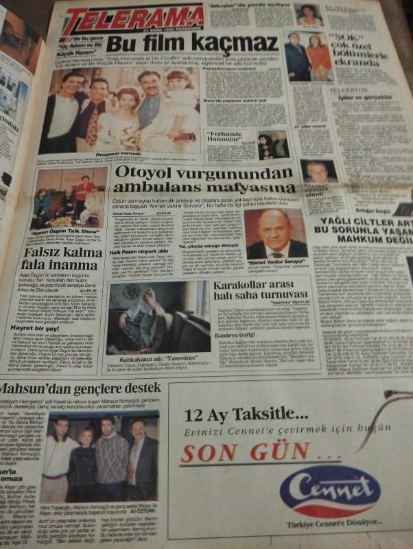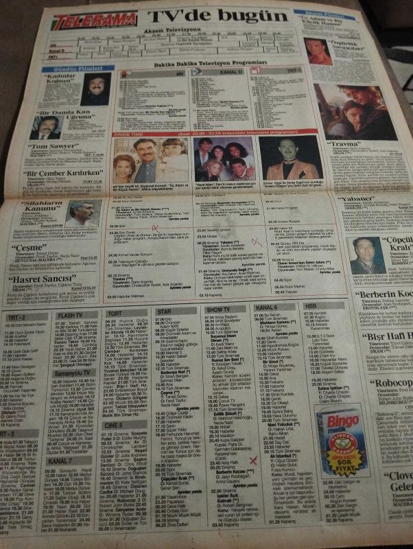 SABAH MELODİ GAZETESİ VE SABAH TELERAMA GAZETESİ KADINLARA ÖZEL - 31 Ekim 1996 -Karikatürler-Walt Disney/Boncuk-Mort Walker-Dick Browne/Bizim Aile-Tom Armstrong/Marvin-Graham Allen-John Dodd/Kral Kedi-Süleyman Turan/Dön Artık-Astroloji-Bülent Kısa-Klinik-Meltem Pusat-Telerama Programı-Sabah Filmleri-Öğlen Filmleri-Akşam Filmleri-Erdoğan Sevgin-laik-nermin abadan-necla arat-aysel ekşi-nazan moroğlu-ilhan selçuk-ebru ergu-erdek-serap Aksoy-elif kıramer-duygusal komedi-otoyol-ahmet Vardar soruyor-yasemince-yasemin yalçın-sürahi hanım-hilmi topaloğlu-mahsun kırmızıgül-meyra-alişan-ali öztürk-uğur dündar-arena-avrupa yakası-kadınlar koğuşu-fatma belgen-serdar gökhan-nejat okçugil-yılmaz güney-nilüfer aydan-bingo-kemal sunal-haber program-ankara rüzgarı-televizyon çocuğu-son durak-sümer ezgü-hayat ağacı-yabancı-haberler ve borsa-sevgi bağları adlı eser, Kitap > Süreli Yayınlar > Gazeteler > Türkiye > Genel > Günlük kategorisinde İkinci El olarak satıştadır.
